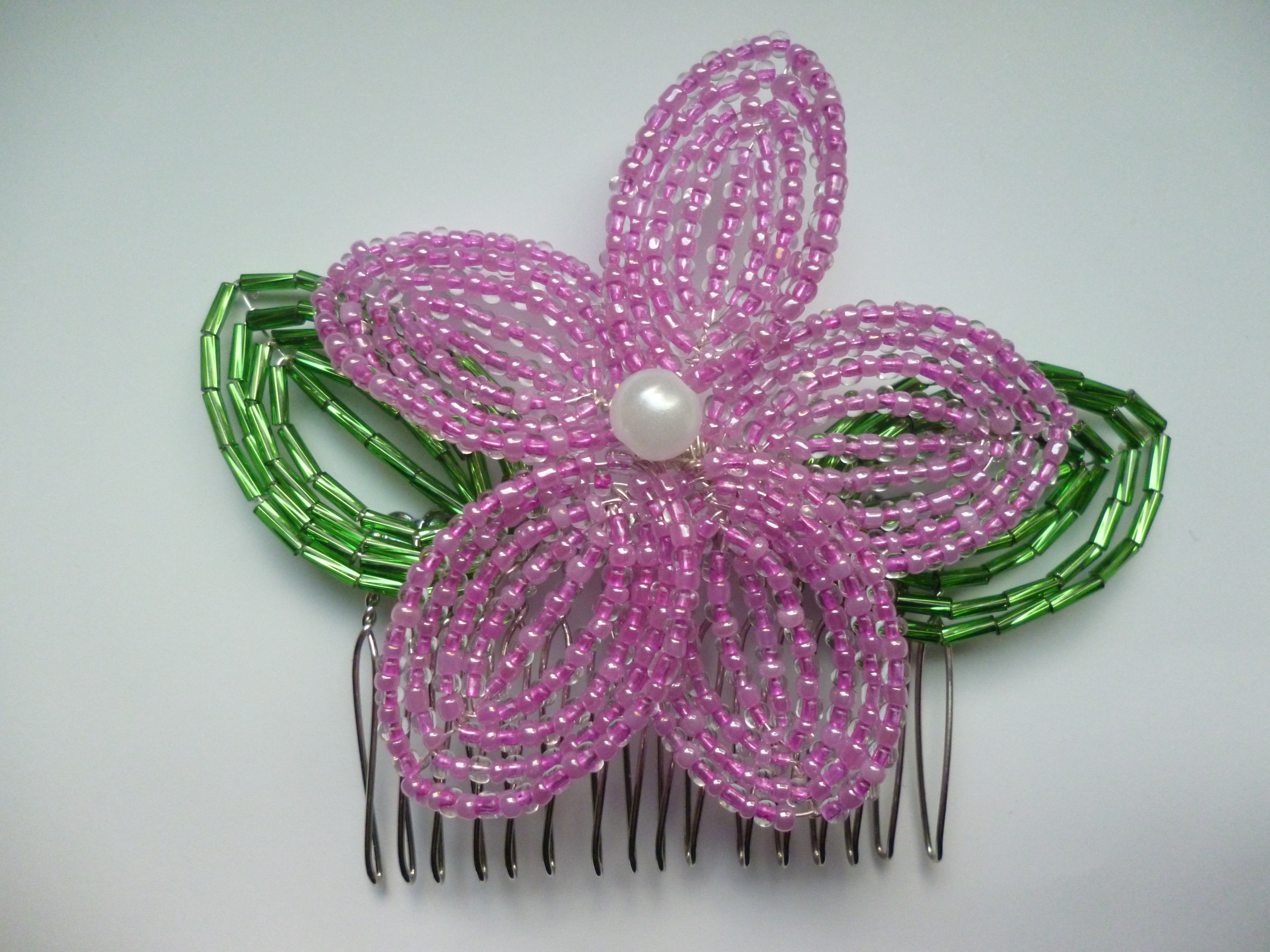 Materials: Pink seed beads (two colours), green bugle beads, one pearl, 0.40mm silver wire, silver hair comb