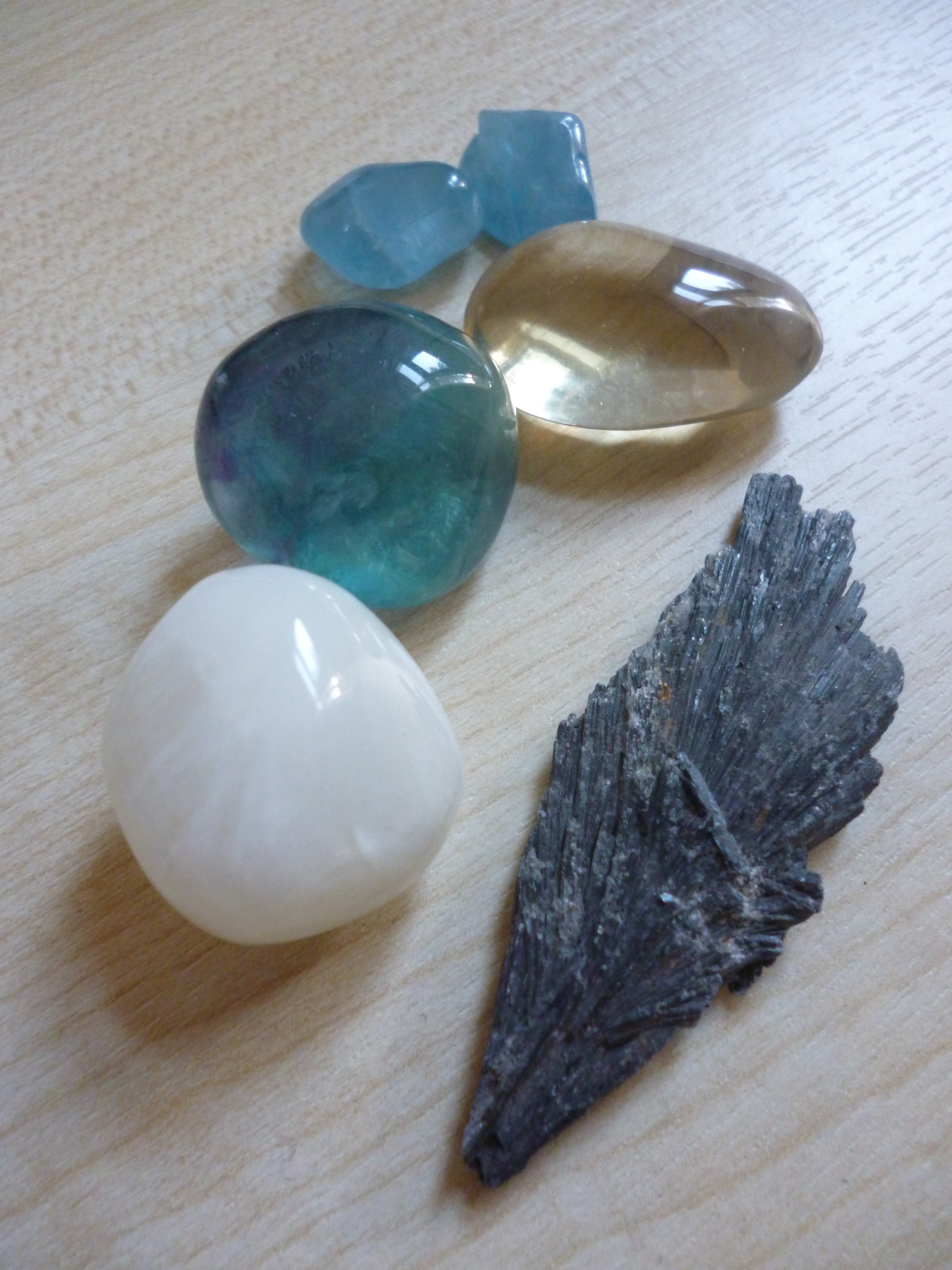 Anyway, I’ve mostly chosen gemstones that I’ve never had before. From top to bottom, theres: two aquamarine stones to possibly turn into earrings, citrine, green fluorite and moonstone for wire wrapping, and a black kyanite stone that looks like a black wing which I might turn into a pendant? Not sure yet.