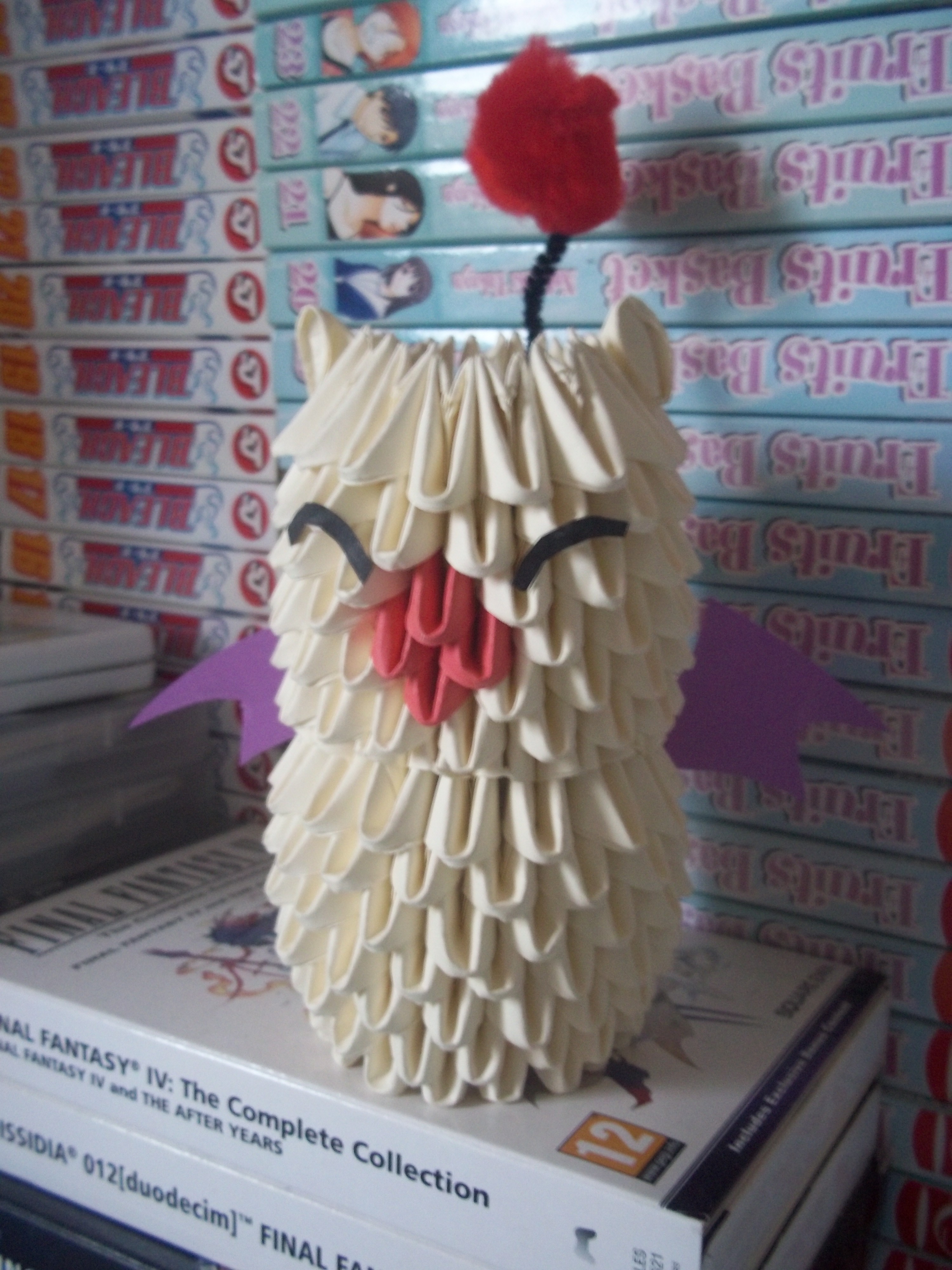 It’s a 3D origami moogle! Truth is, I made this over a year ago now, but I finally made the video tutorial for it! Click me to see it, and please let me know what you think. ^_^