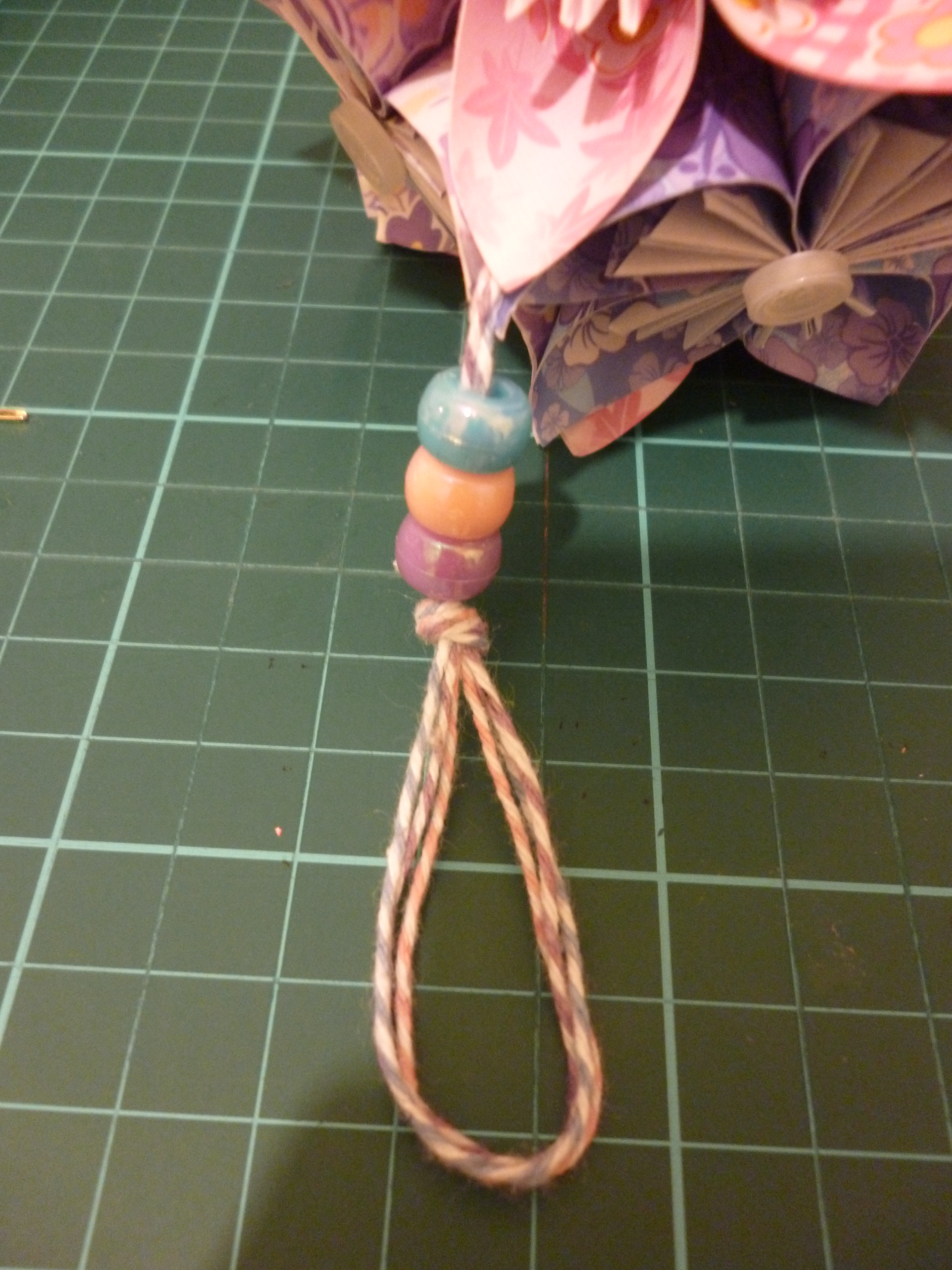 String up the kusudama. I coordinated coloured twine, beads and cranes.