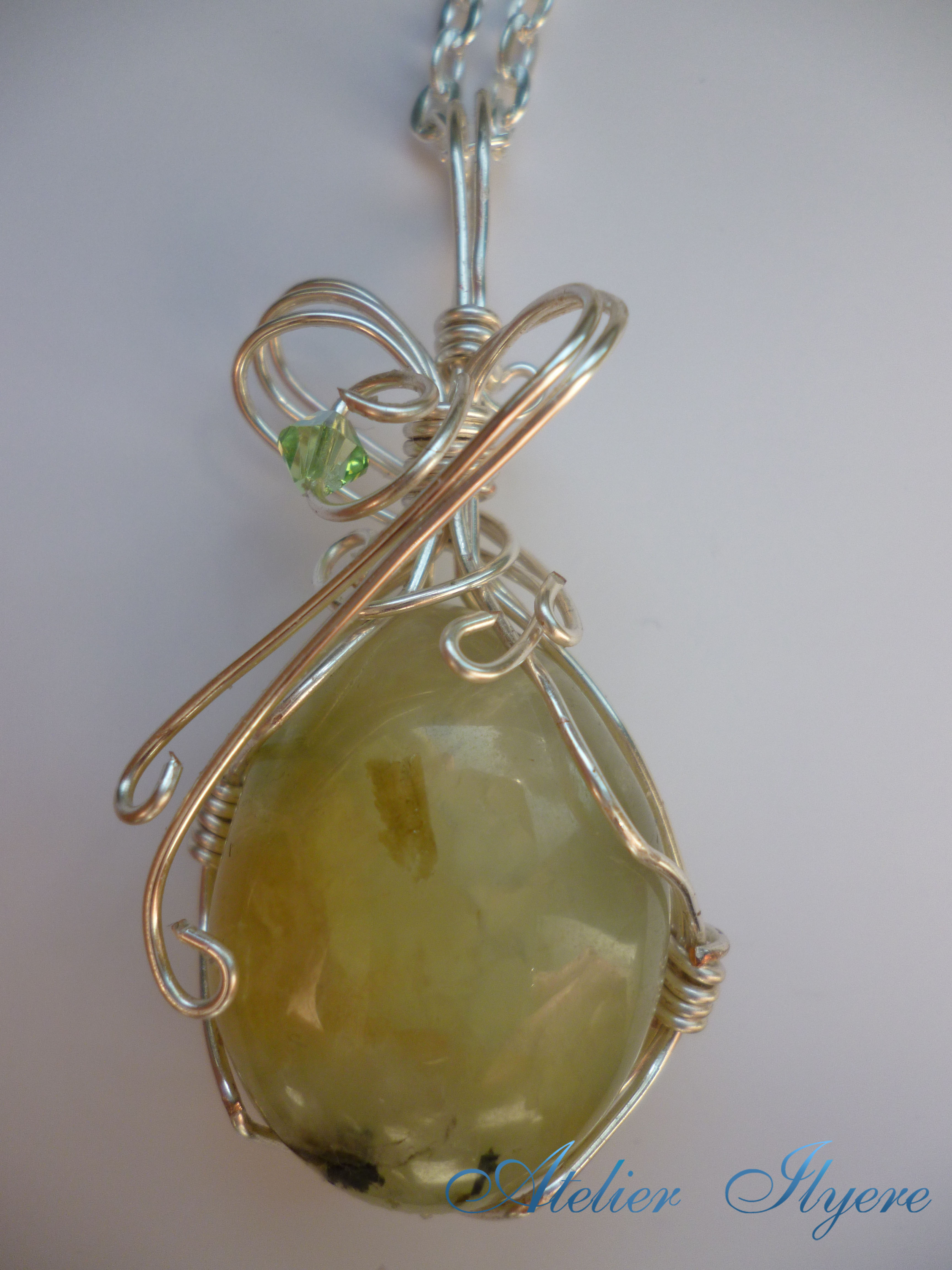 Materials: Prehnite and epidote gemstone, 0.80mm silver-plated wire, one Peridot Swarovski AB bicone bead, jewellery pliers