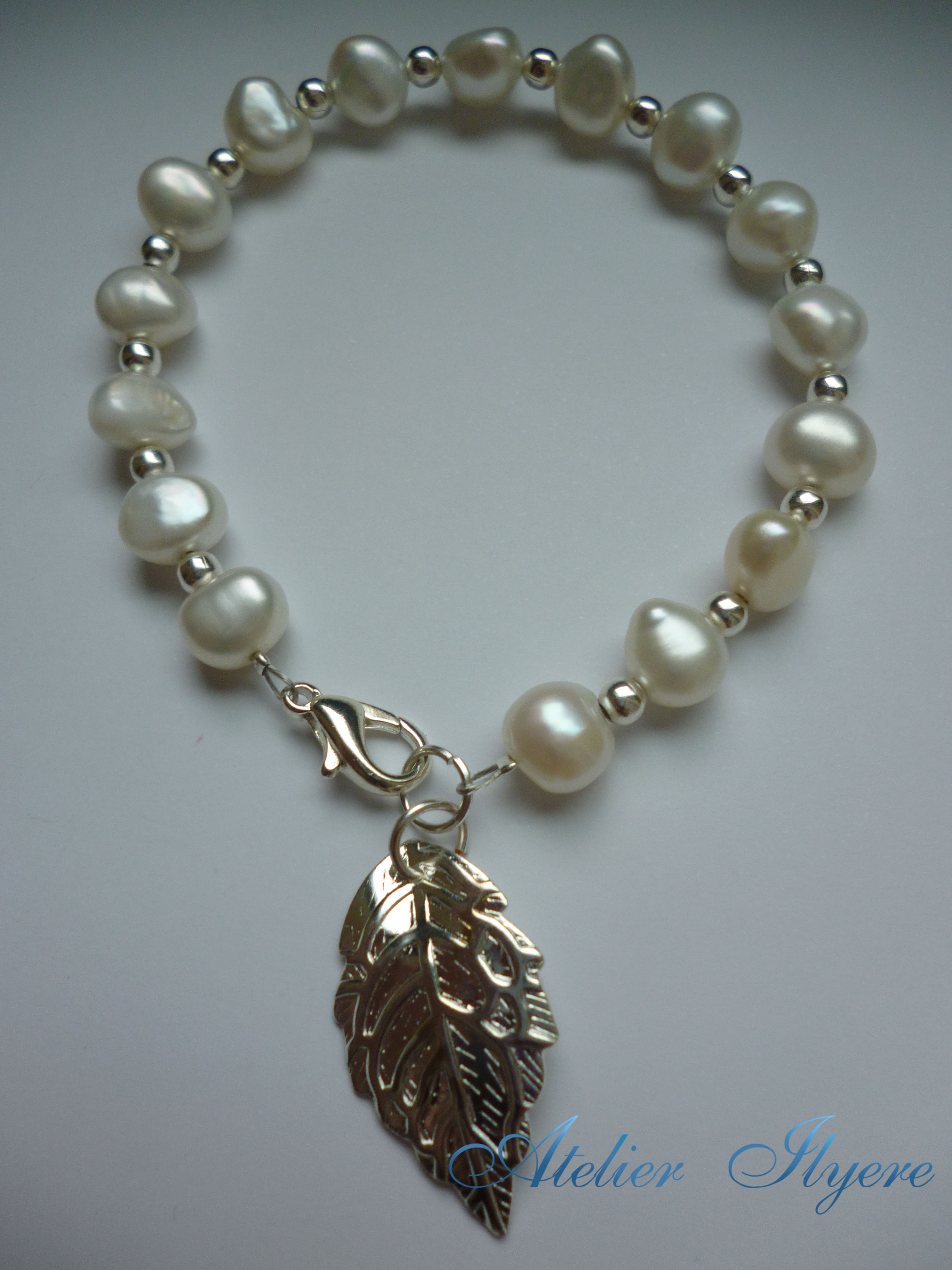 Materials: Freshwater pearls, silver ball beads, metal thread, silver crimp beads, silver leaf charm, lobster clasp and ring