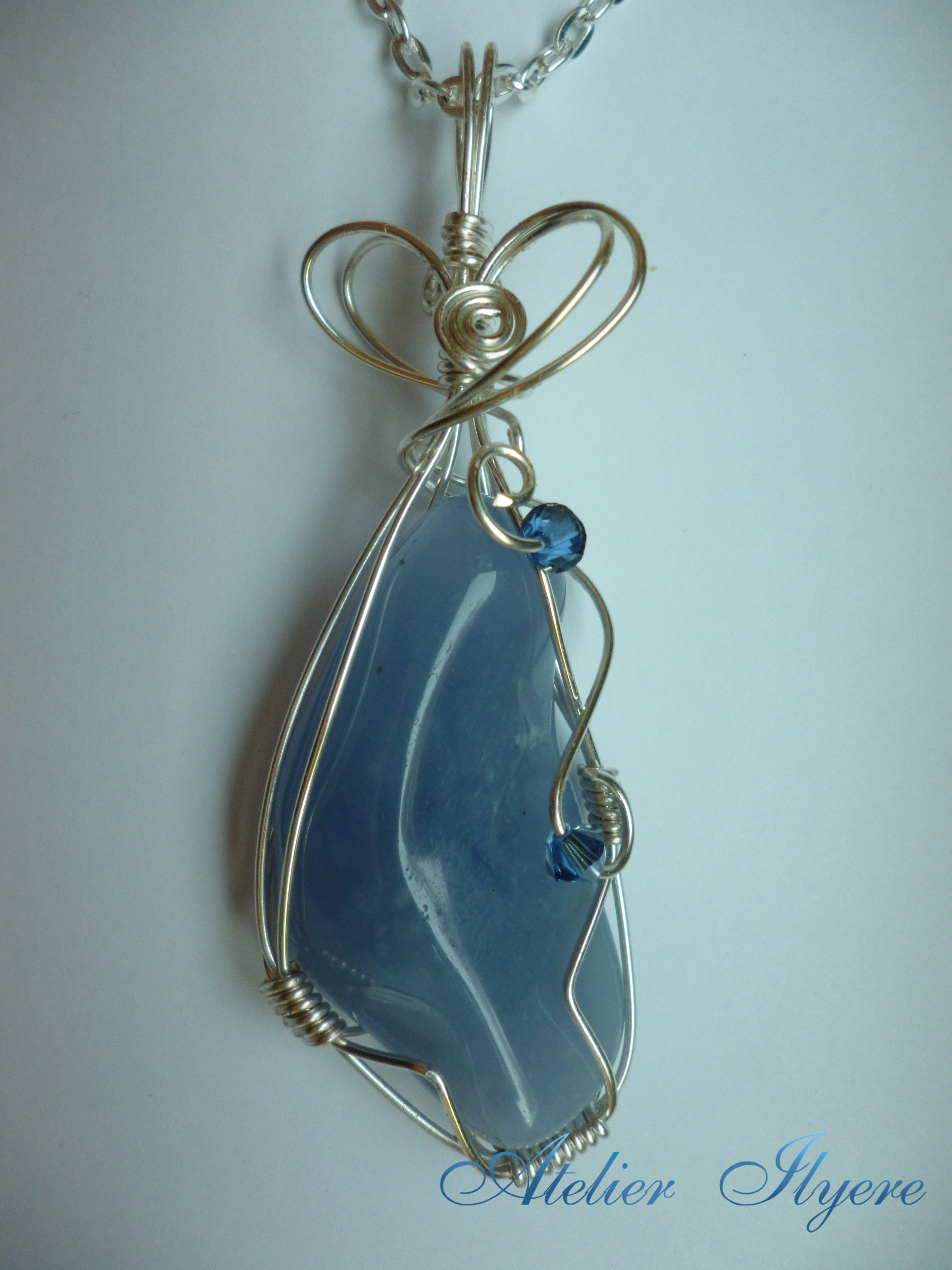 Materials: Blue chalcedony gemstone, 0.80 silver-plated wire, two Sapphire Satin Swarovski AB bicone beads