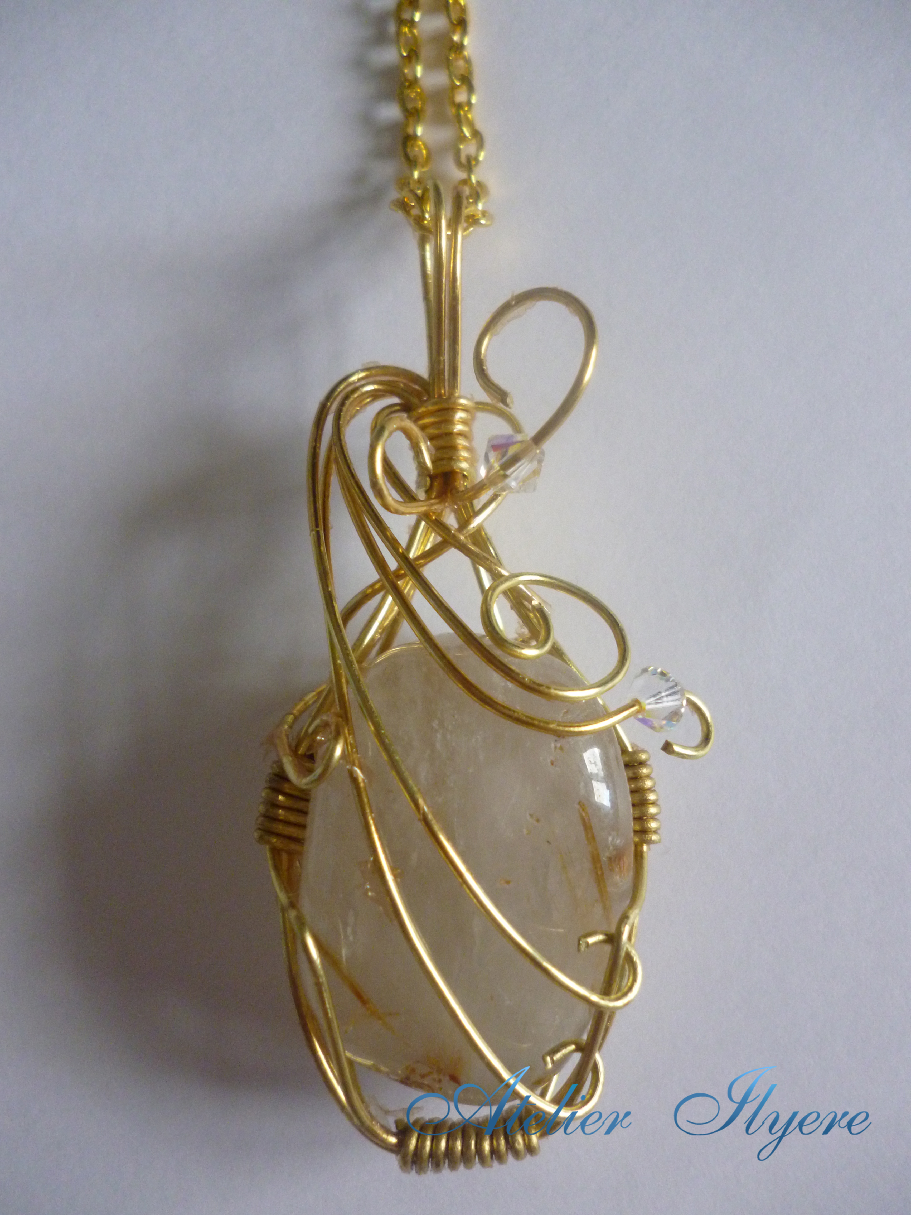 Materials: Rutilated quartz gemstone, 0.80mm brass wire, two Crystal Clear Swarovski 4mm bicone beads