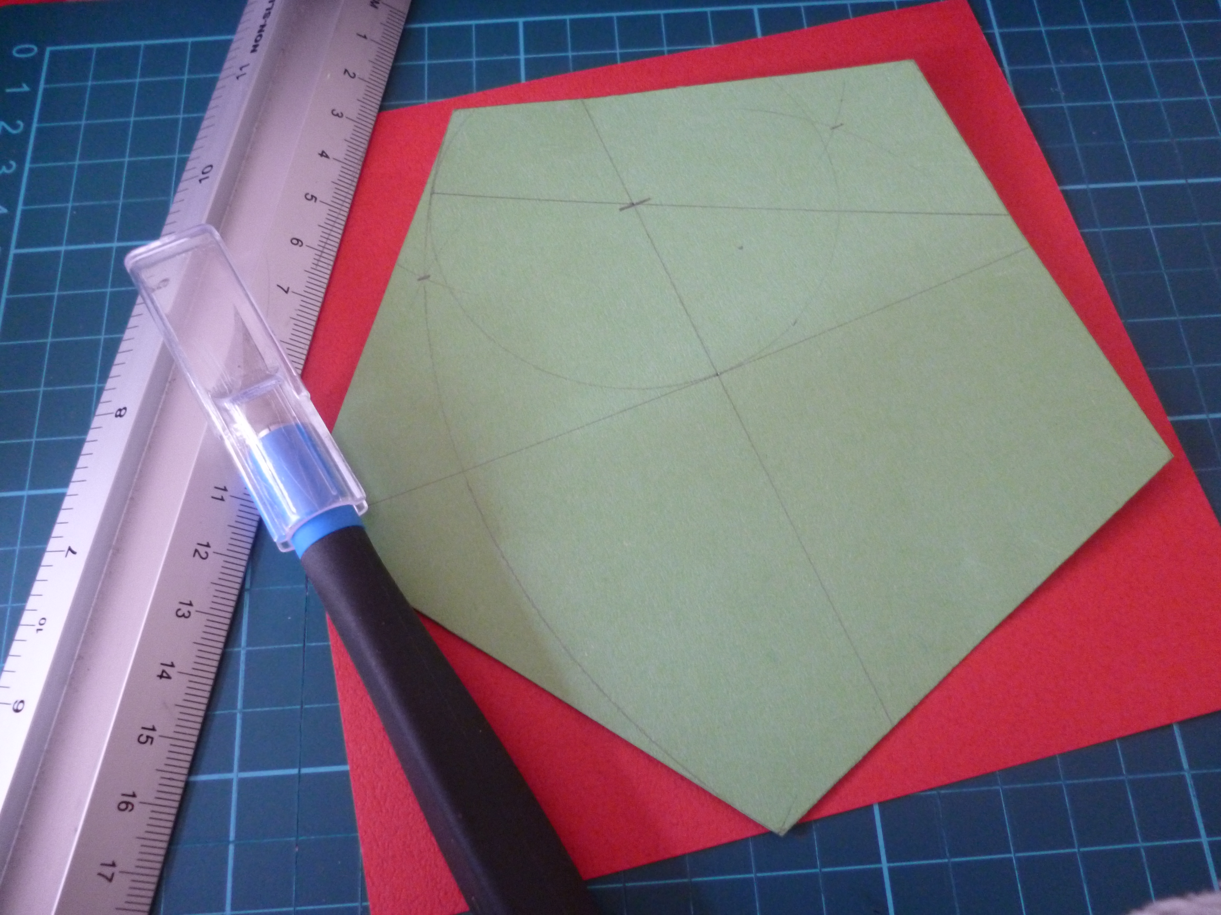 To make the proper Sato rose, you need to start with a pentagon. I drew out the largest pentagon that could fit on a 15cm square by using a compass and pencil on card, then cut it out to use as a stencil for the red paper.