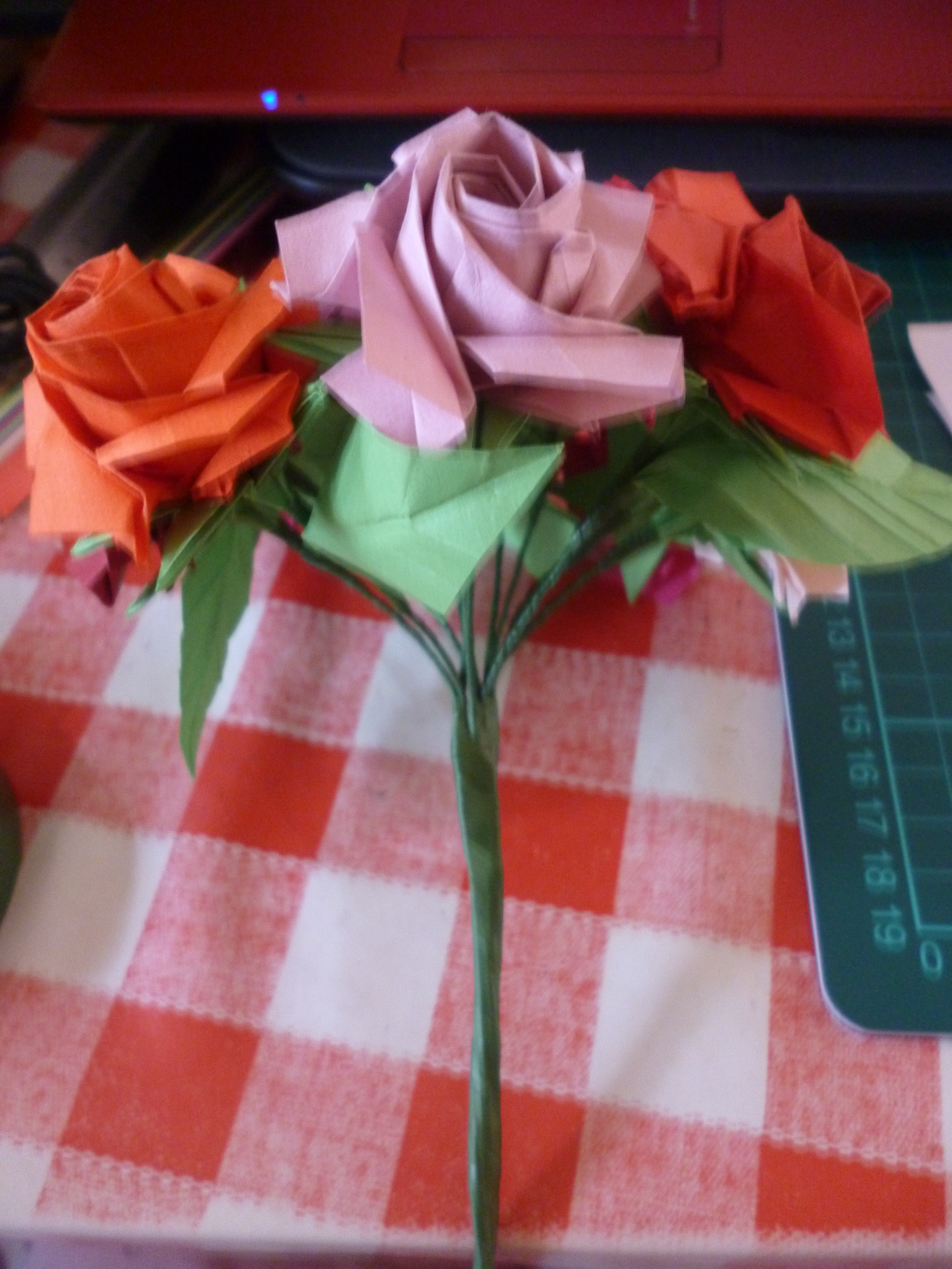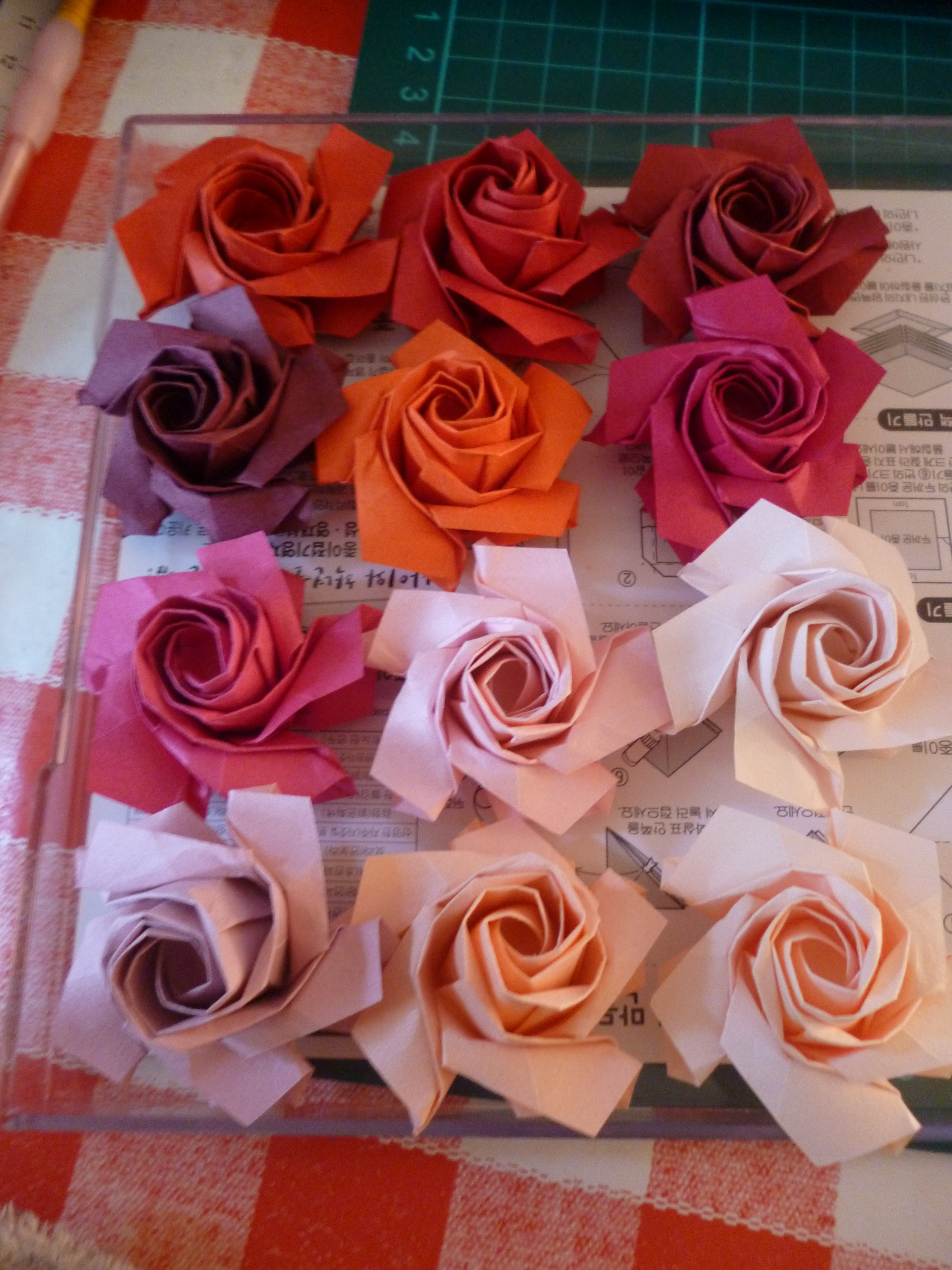 Here’s a picture of all twelve roses in their lovely different colours and styles that I ended up making, haha. Look how small the bunch are! That case underneath them is for 15cm paper.