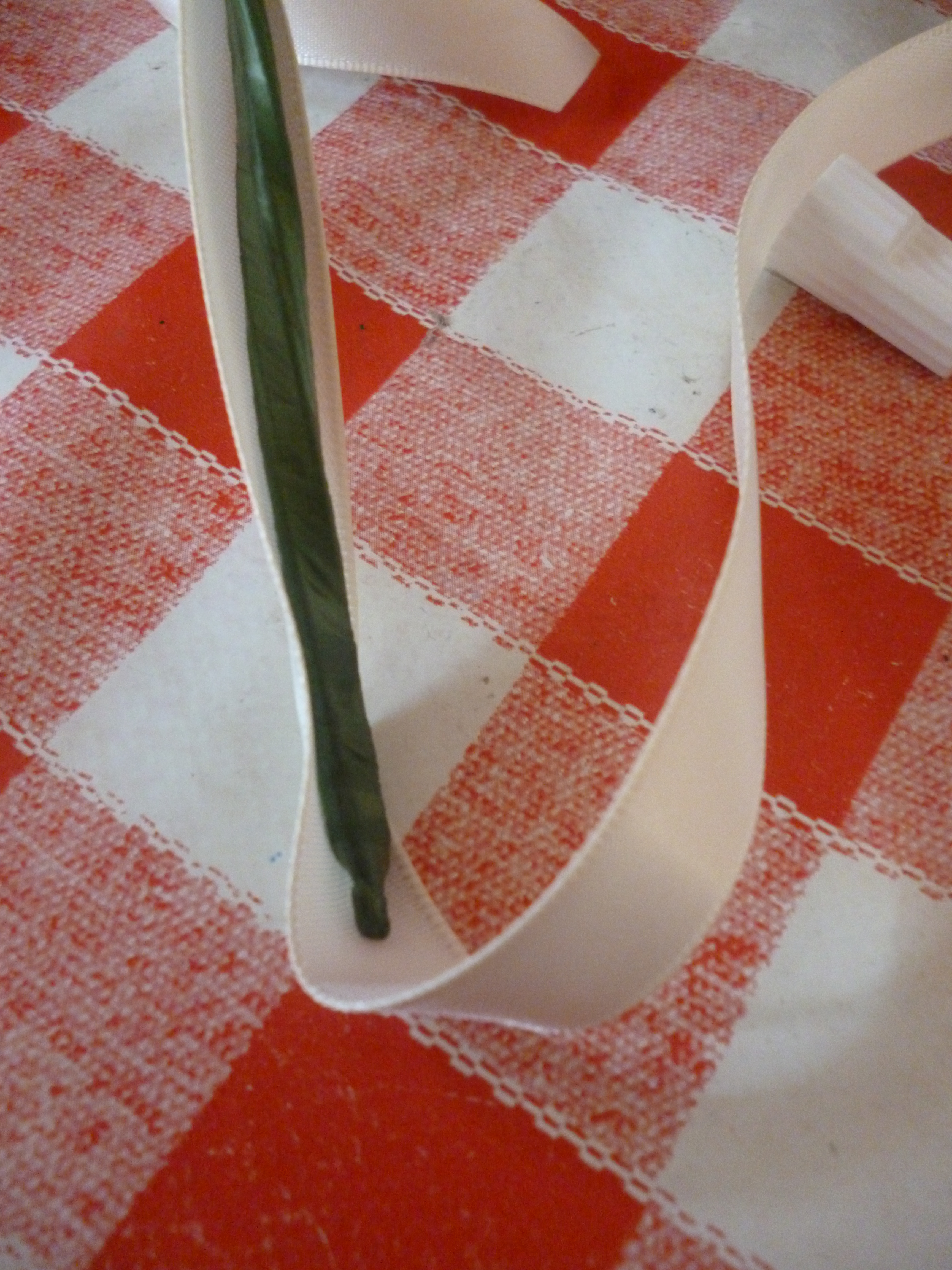 Once the wrapped ribbon winds all the way up to just above where the green tape for large stem begins, tie a neat knot and finish with a bow.