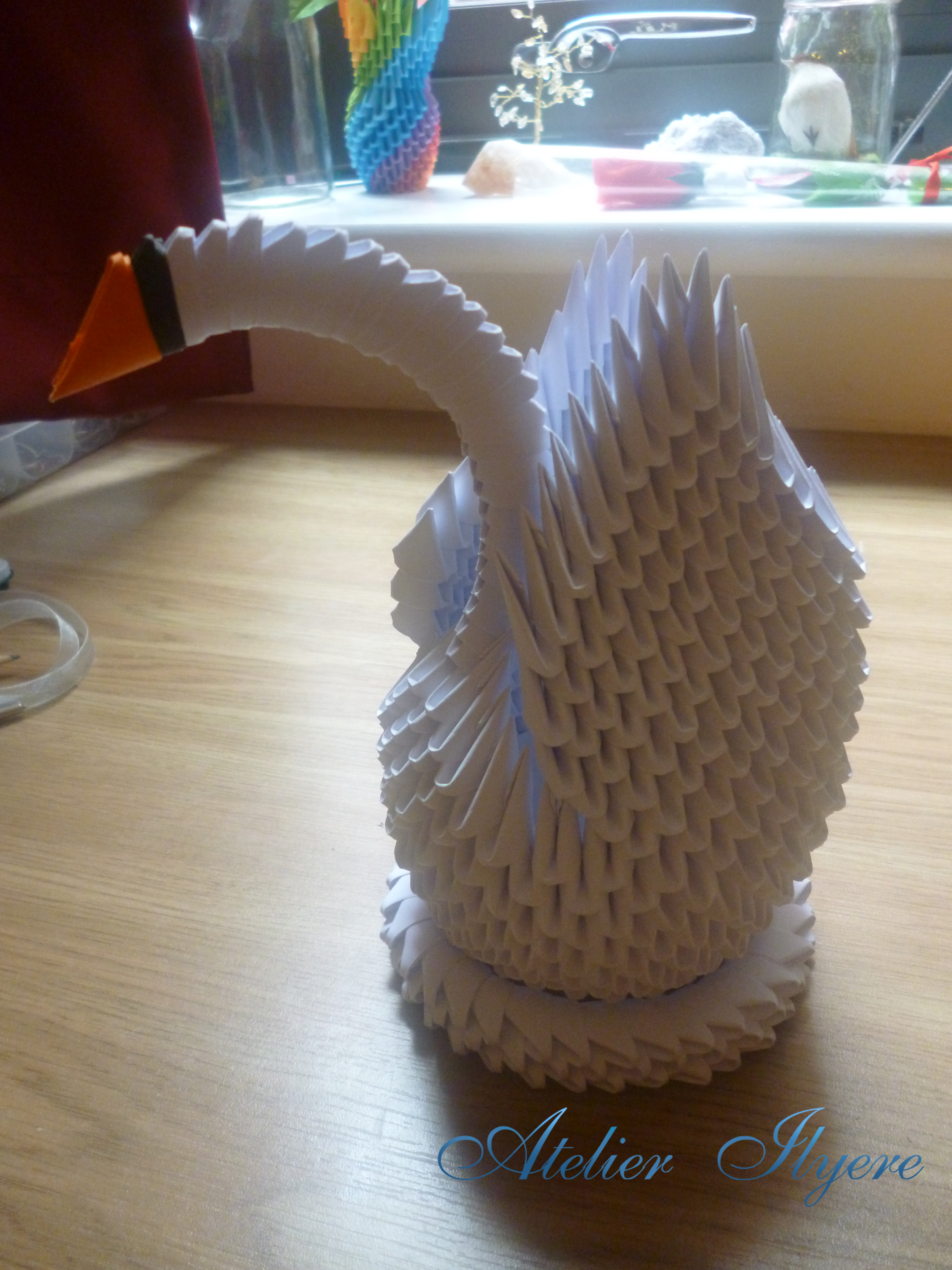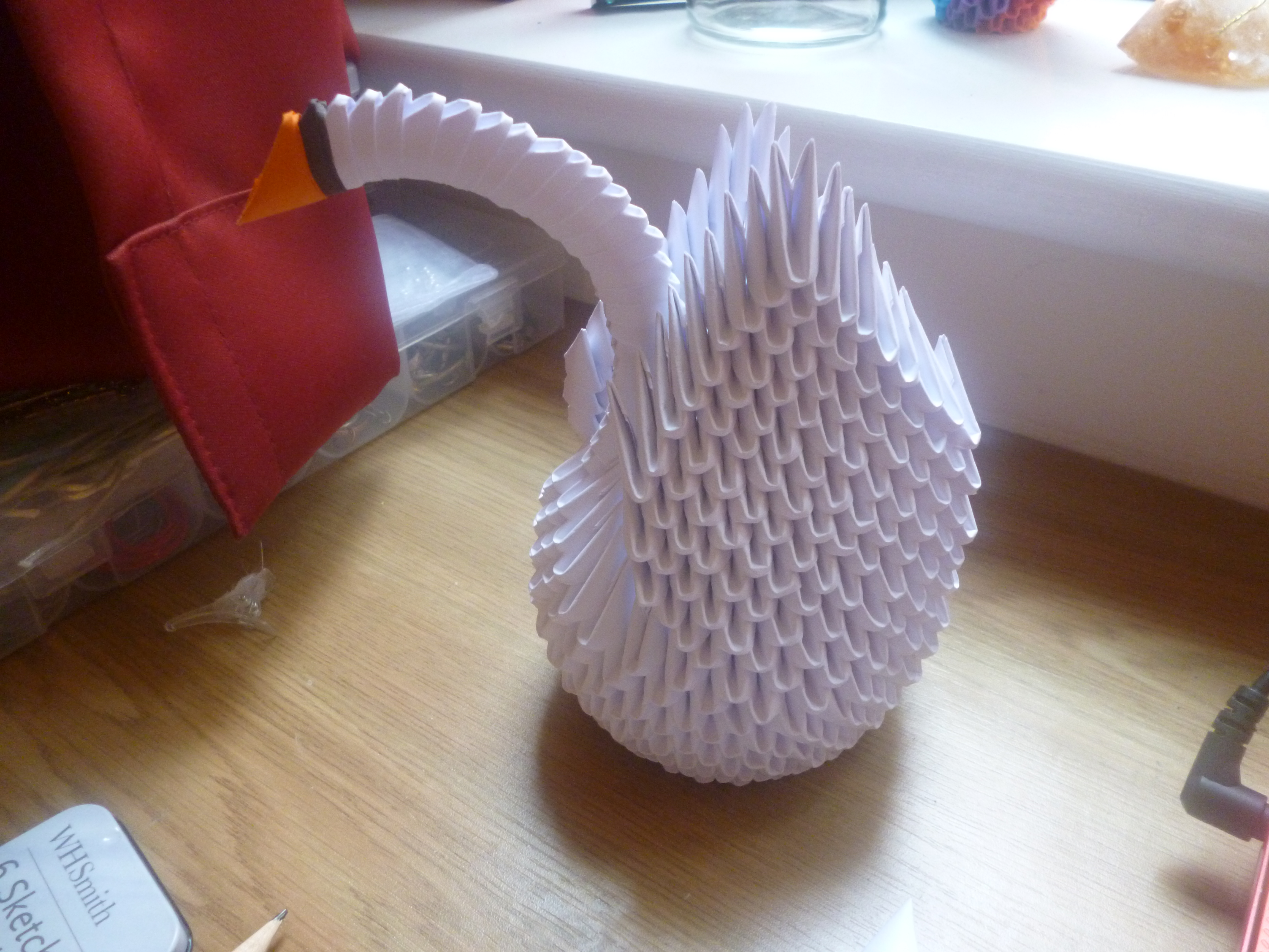 This particular project was started back in the first semester, when I had bought a large pack of white paper. I started making 3D units for the heck of it, and then thought it would make a nice swan. I’m made a stick-tailed peacock before and a phoenix, but not a plain old swan, funnily enough!