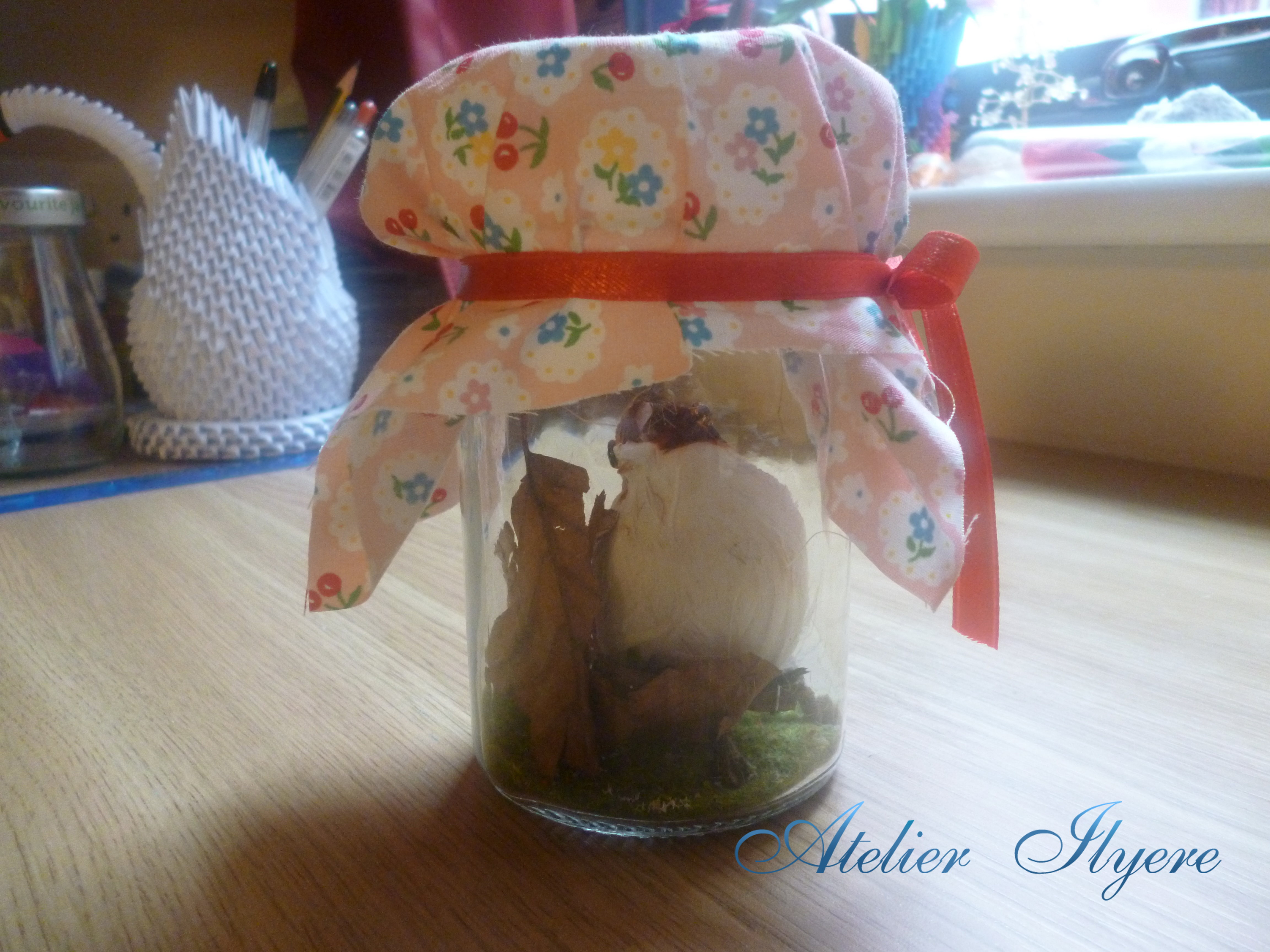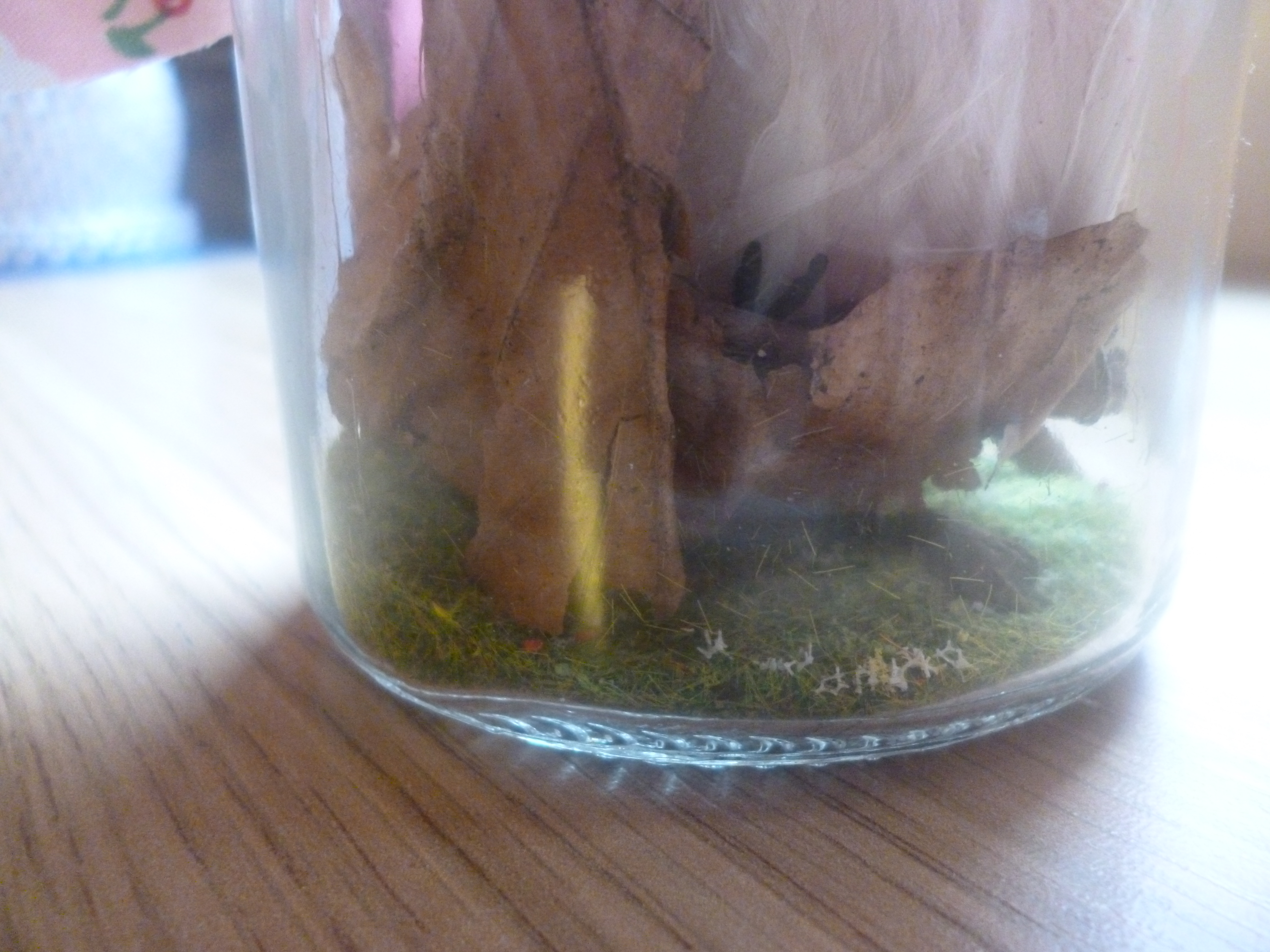 Materials: Small jar, bird figurine, fabric, ribbon, wire, fake grass, twigs, dead leaves