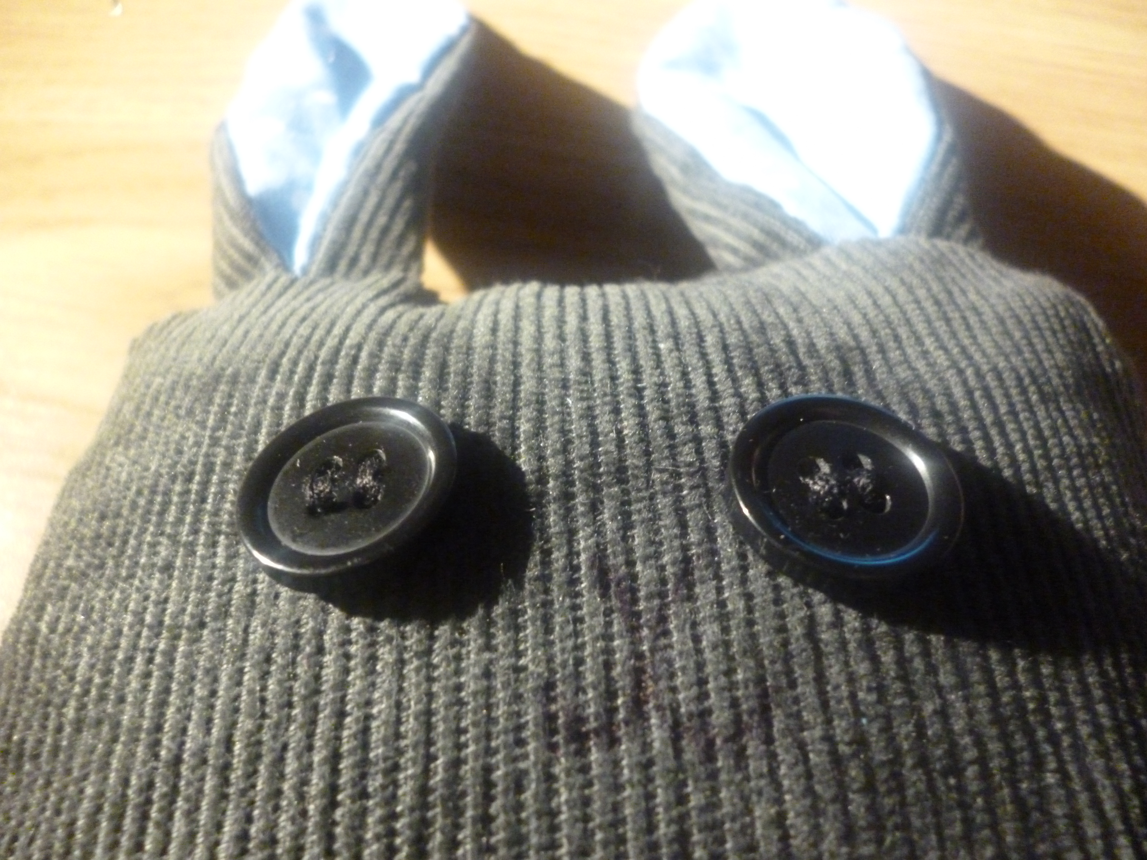 Why button eyes? Well, at first I attempted to embroider eyes… Then I realised that black was actually really hard to see against the very dark grey fabric, haha.