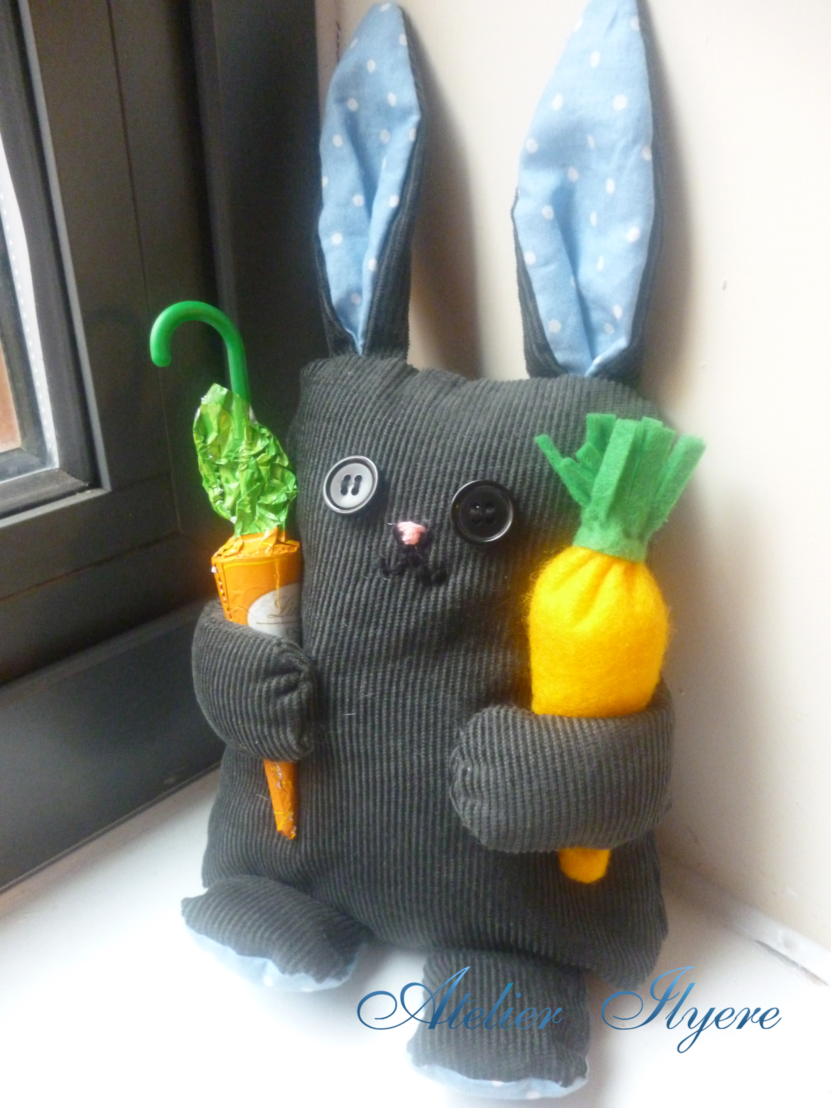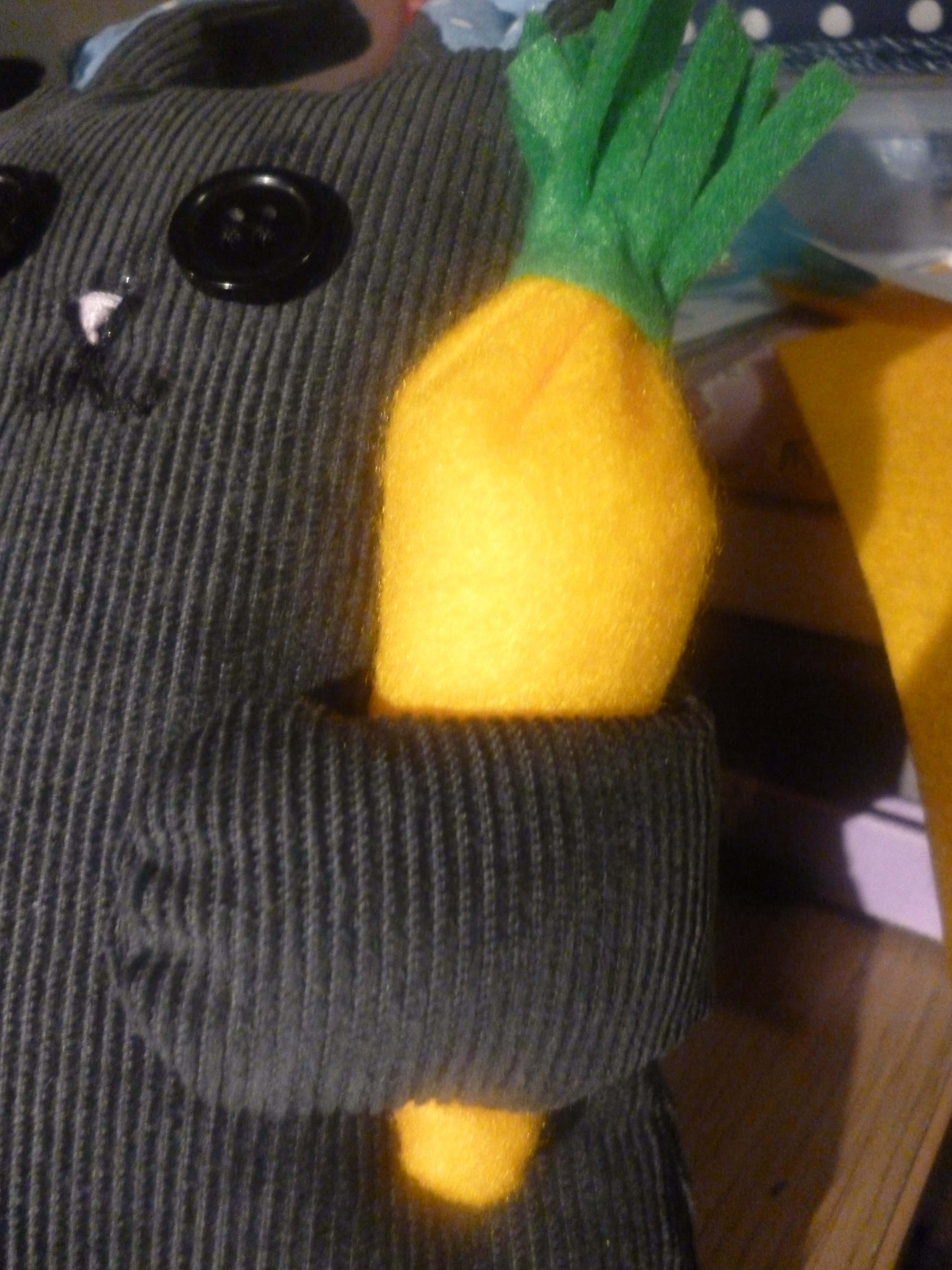 The arms are slipstitched to the body with a small gap so that the bunny can hold stuff, like the carrot!