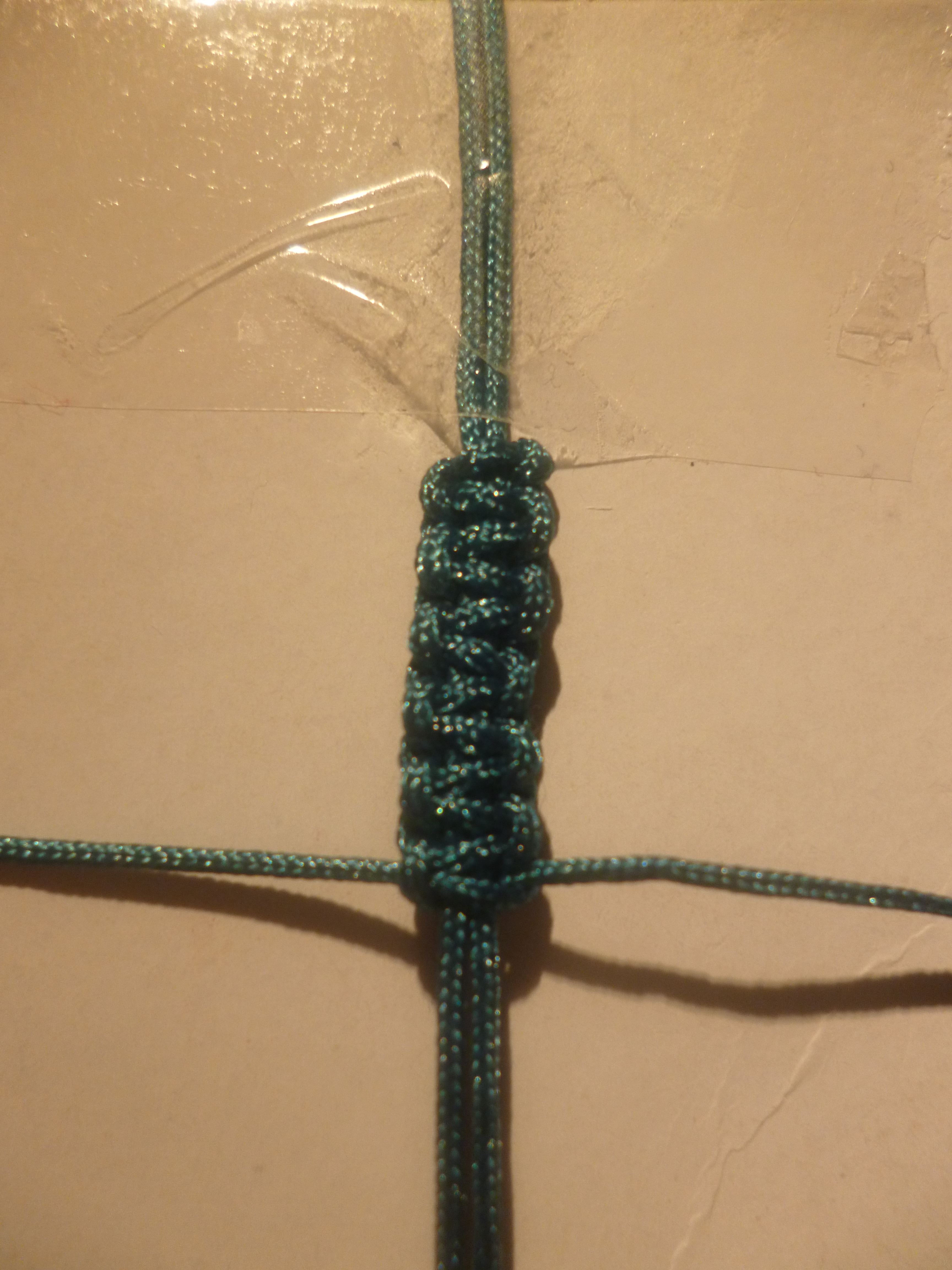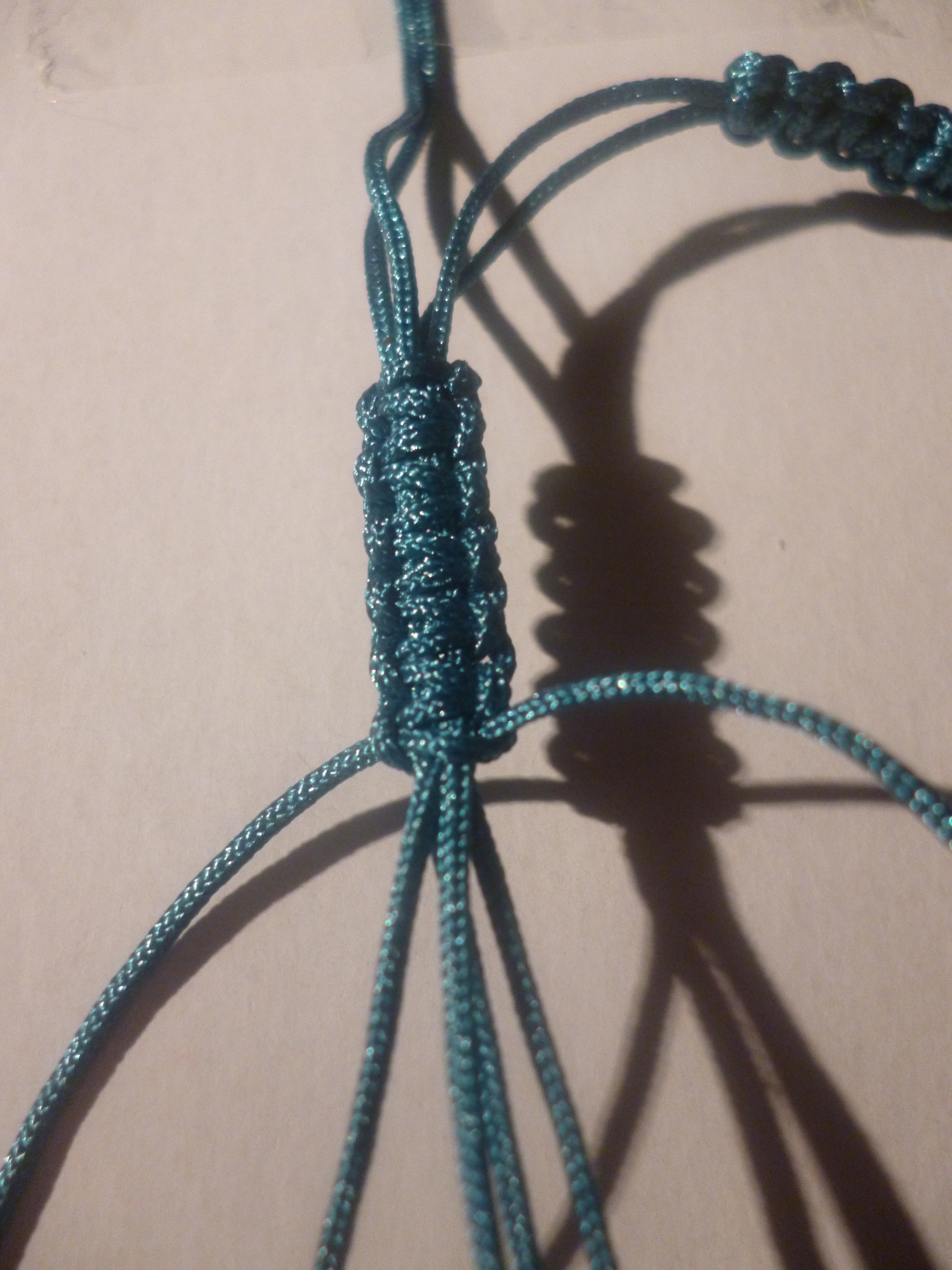 P1010276After tying enough knots, the beads are simply added and the cords continue as normal. It looks surprisingly nice!
