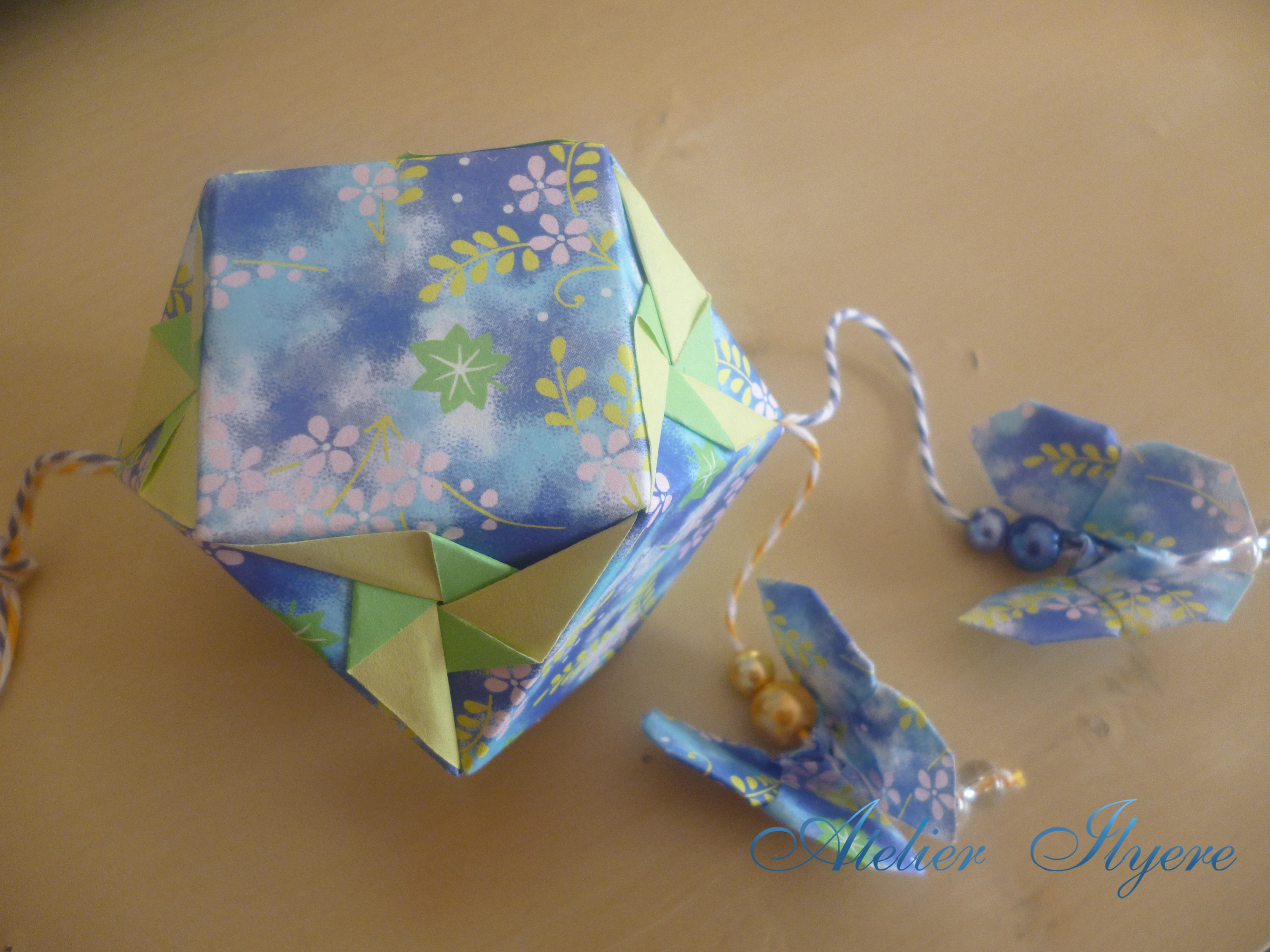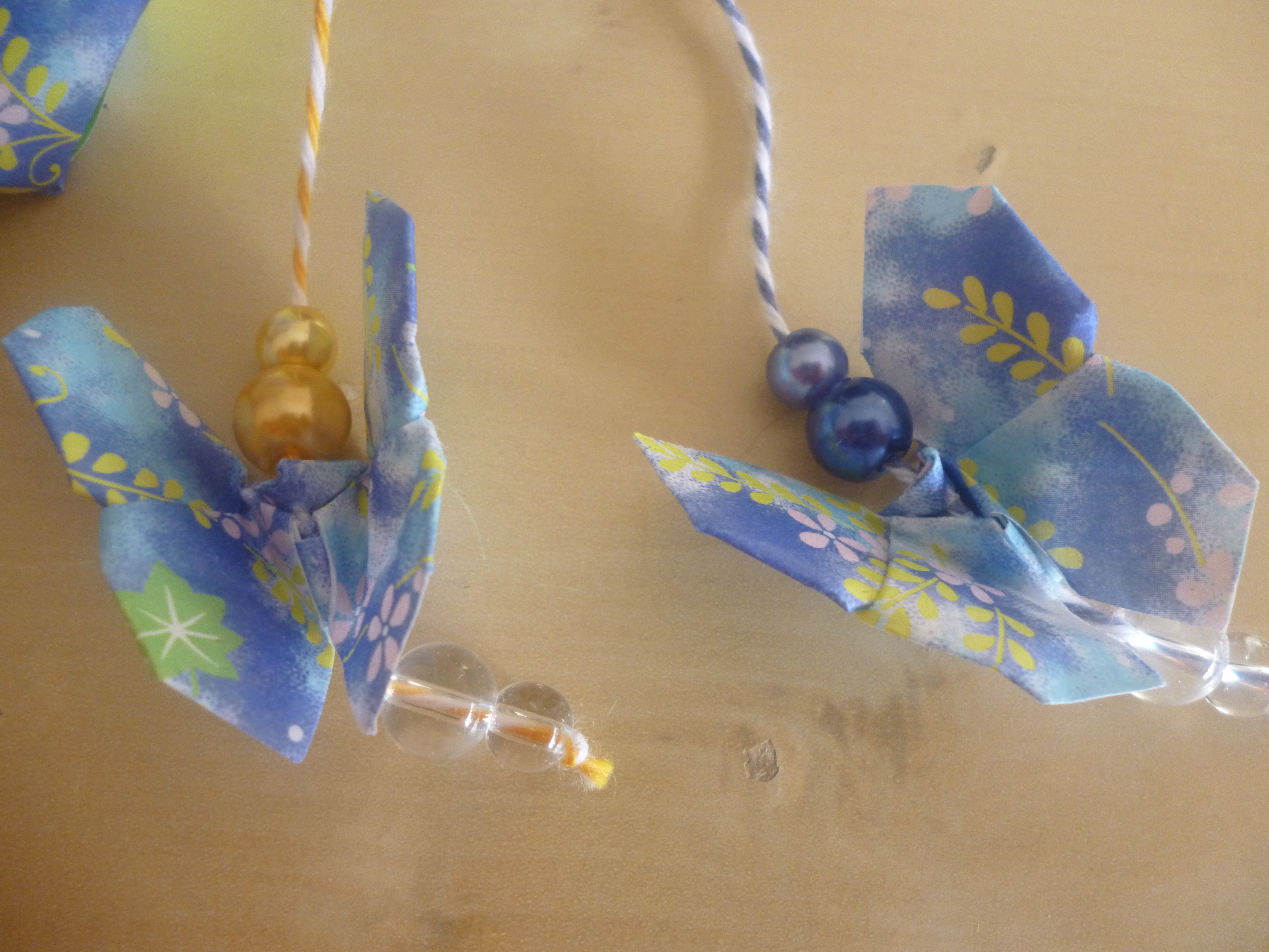 I had two leftover pieces of the pattern chiyogami left, so I made Yoshizawa butterflies out of them (the v2 version) and made them hang off the coloured twine, with matching coloured beads.