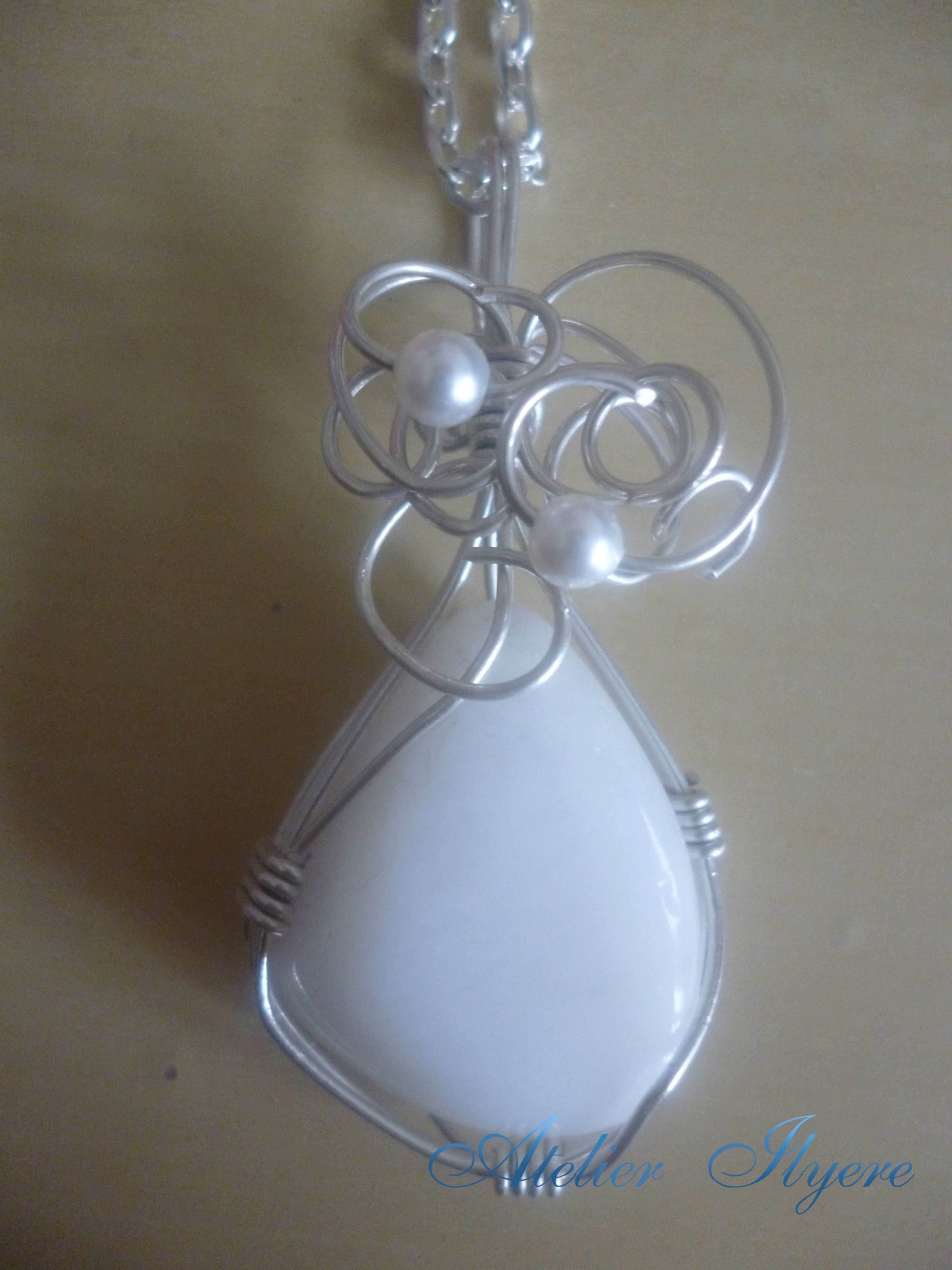 Materials: Snow quartz gemstone, 0.80mm sterling silver wire, two Swarovski pearls, silver chain