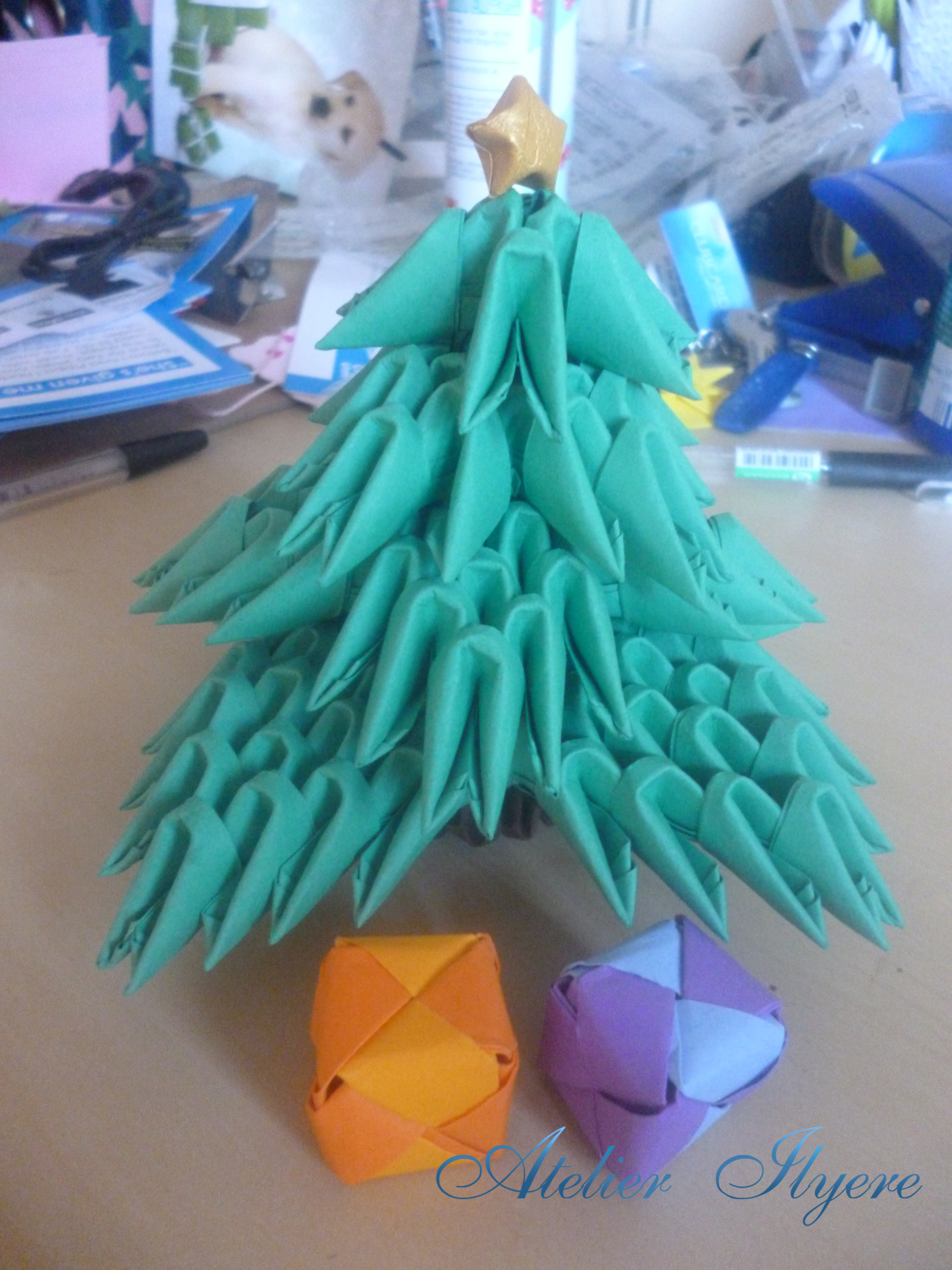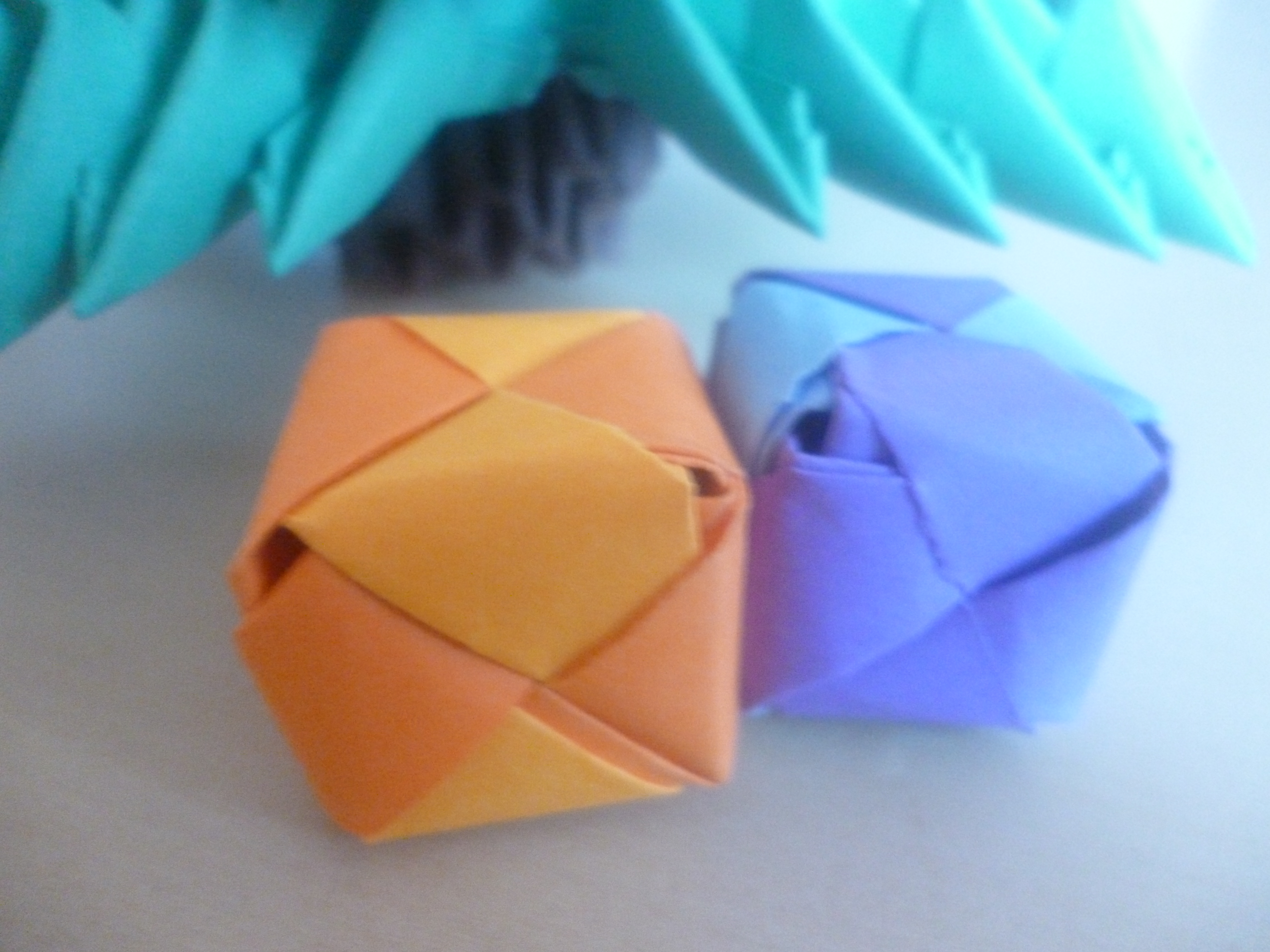 Materials: 192 green units, 30 brown units, two small Sonobe cubes, one yellow origami star, PVA glue