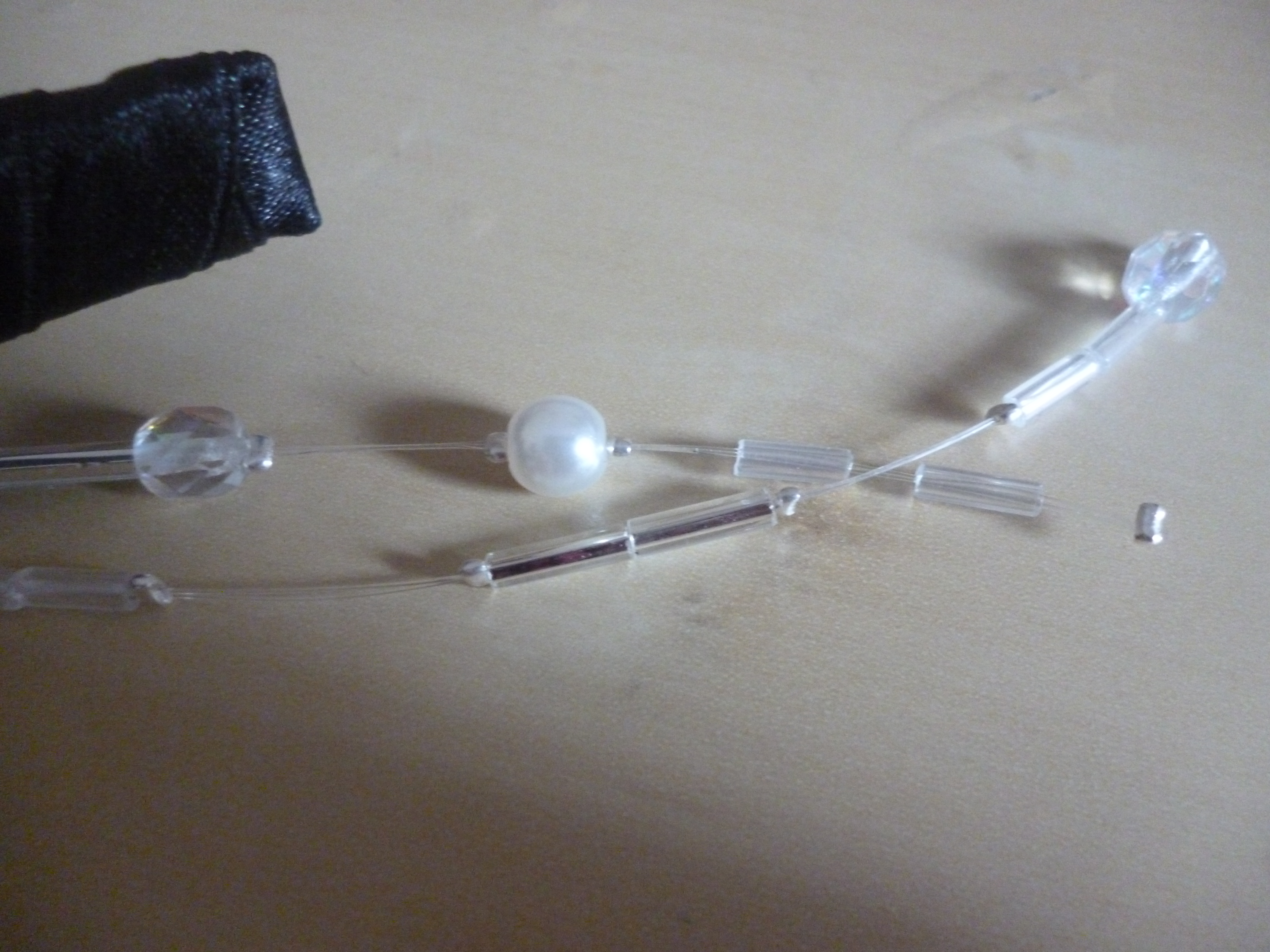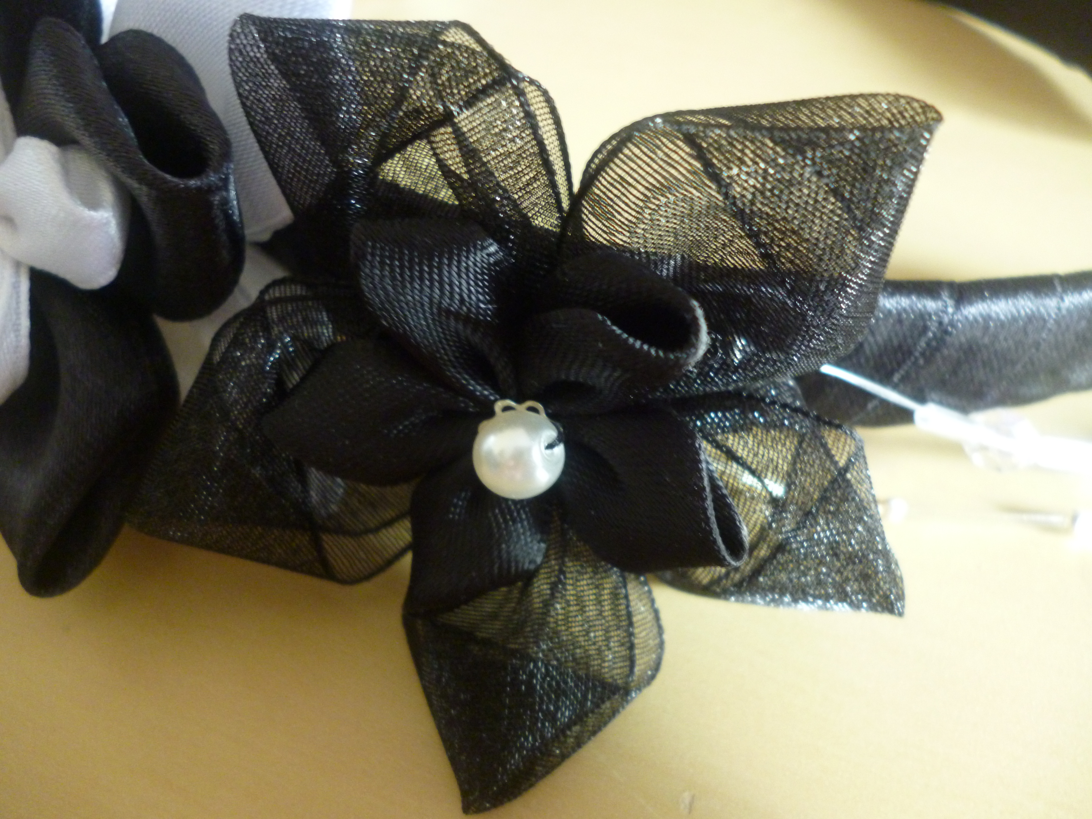 Materials: black and white satin ribbons, black organza ribbon, hairband, crystal beads, silver and clear bugle beads, pearls, superglue, white thread and needle