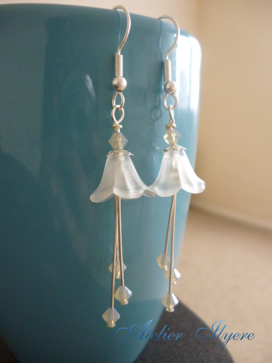 Materials: acrylic white flowers, Sand Opal Swarovski bicone beads, silver filigree end cap, silver earring hooks and end pins
