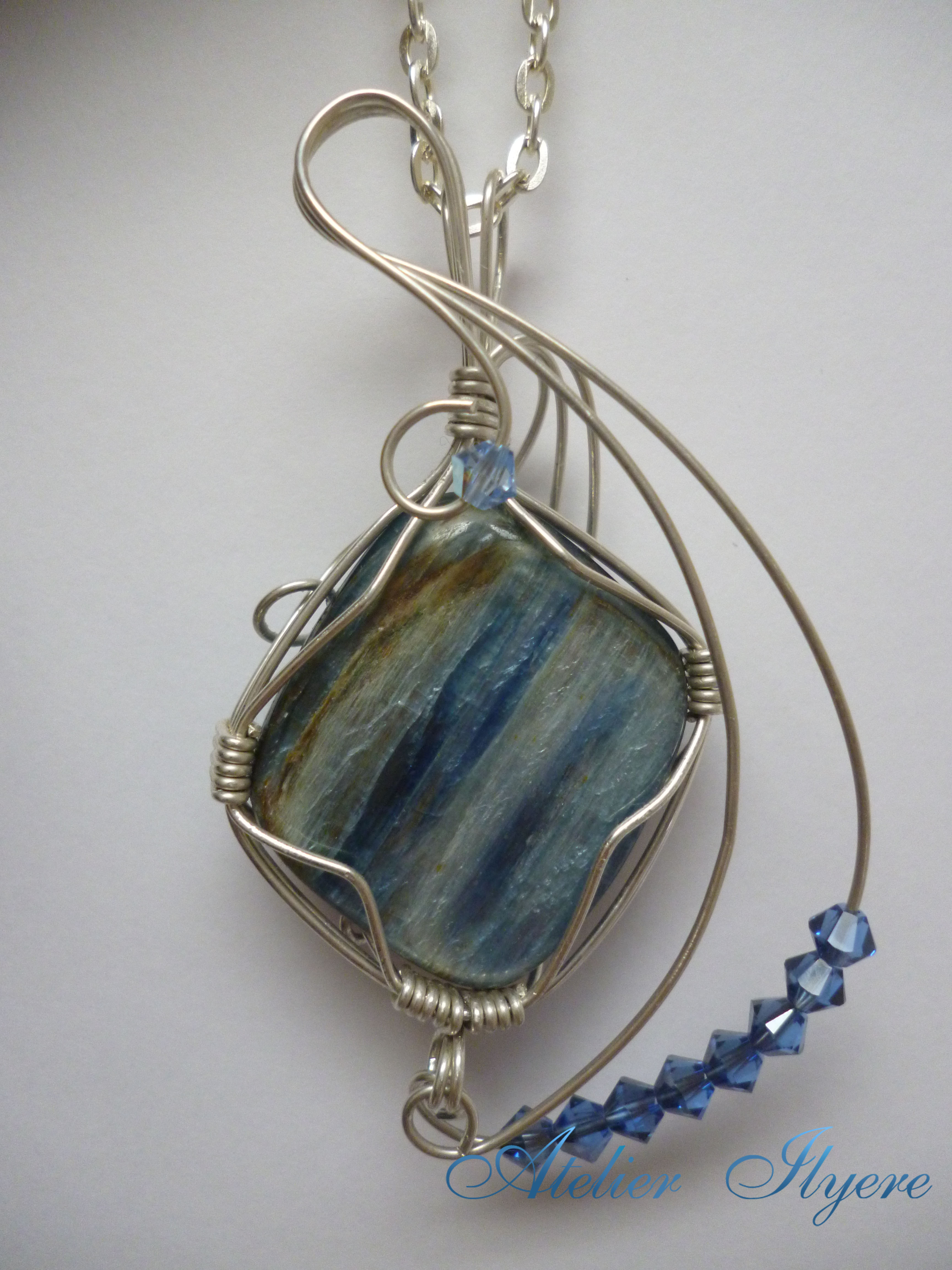 Materials: Blue kyanite gemstone, eight 4mm Sapphire Swarovski bicone beads, one 4mm Light Sapphire Swarovski bicone bead, 0.80mm sterling silver wire