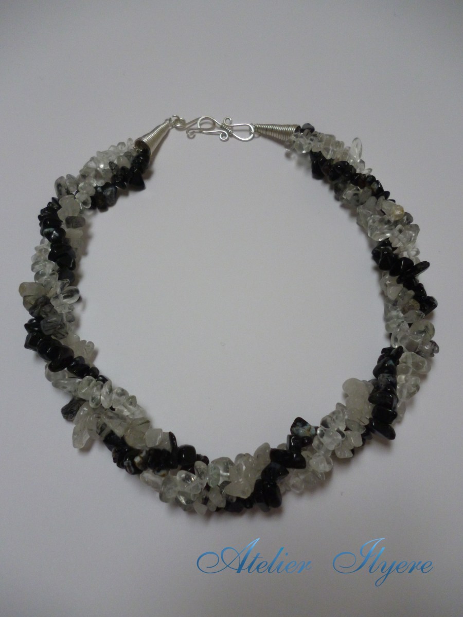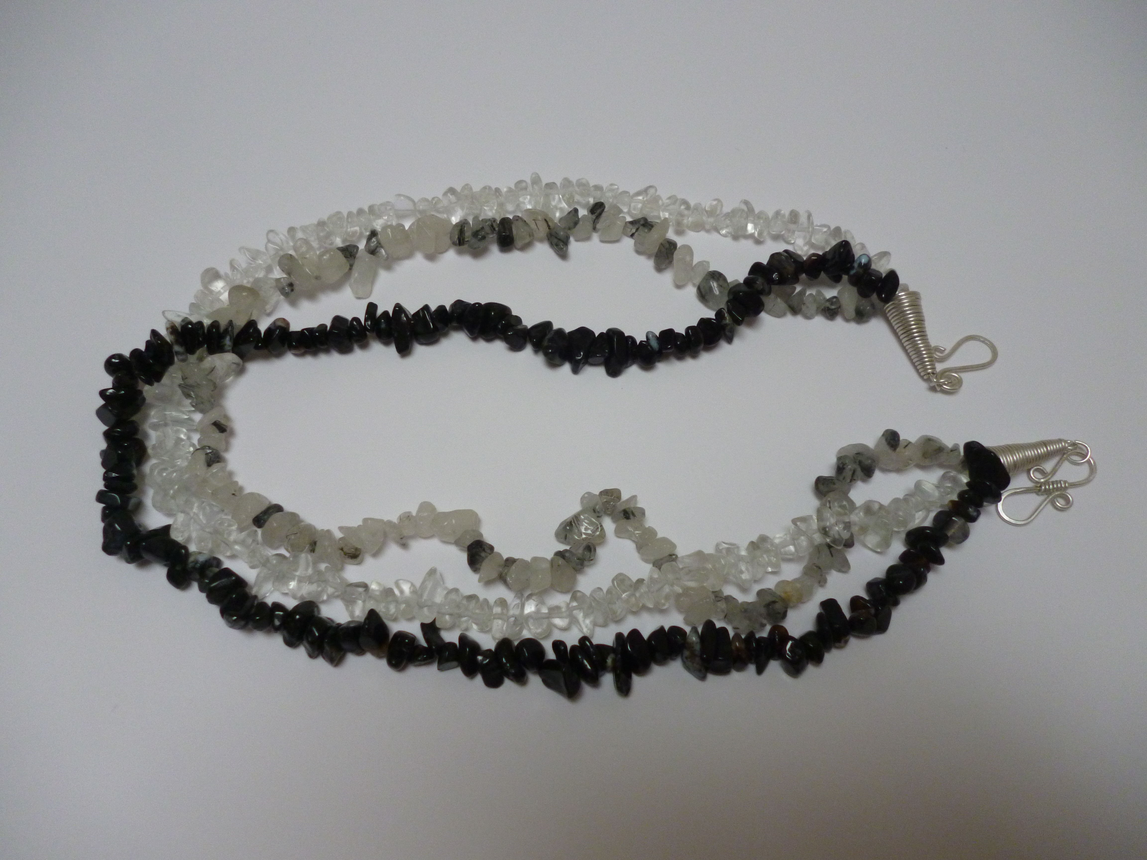 Materials: Clear quartz gemstone chips, tourmilated quartz gemstone chips, black agate gemstone chips, clear thread, crimp beads, 0.80mm and 1.00mm sterling silver wire