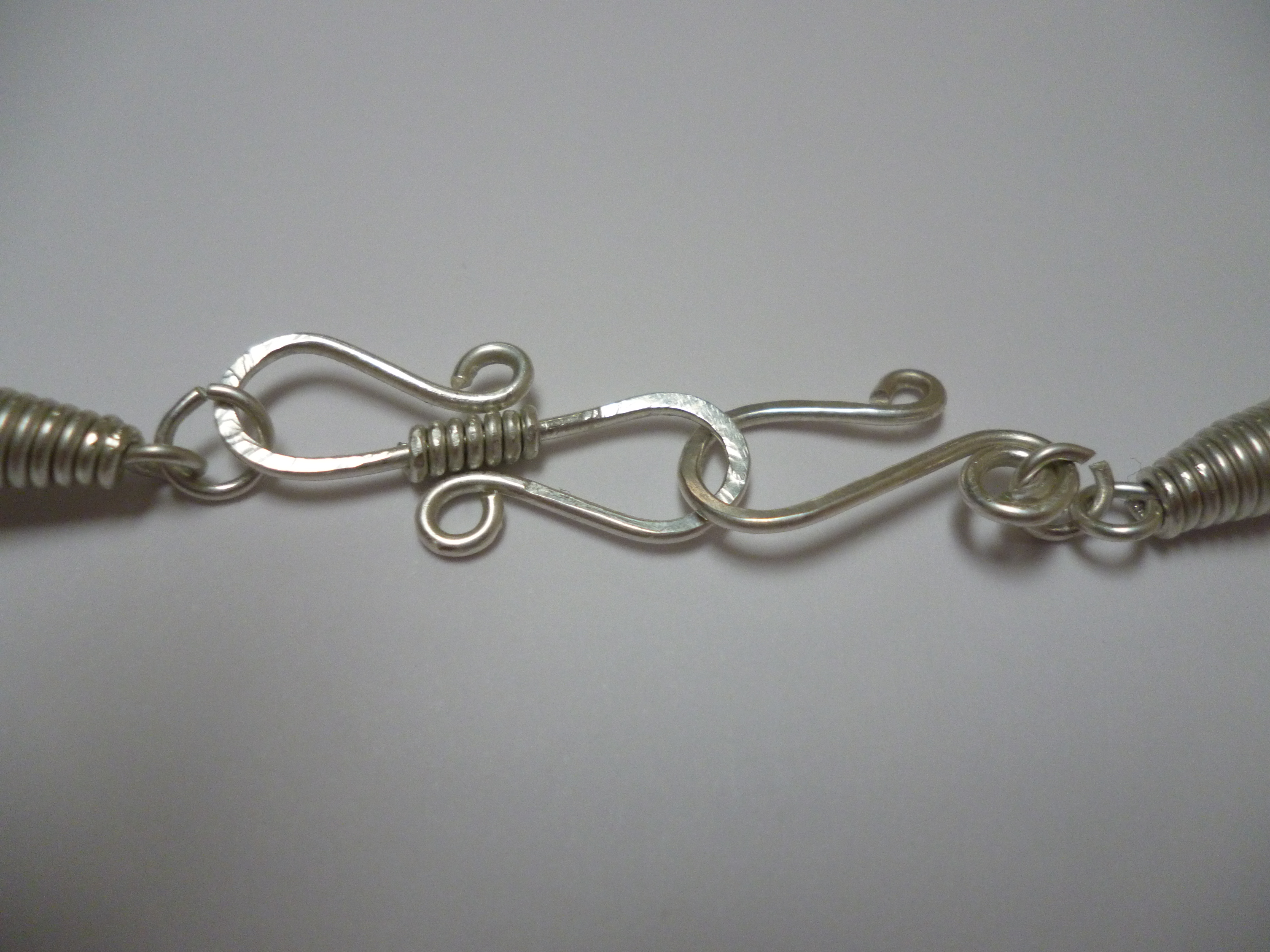 I’m using a new fastener again. This one is an S-shaped clasp with 0.80mm wire wrapped around the middle of the S only. Before it was 0.40mm wrapped around the entire middle length. I think this one looks better though. Still trying to get the hang of hammering clasps though!