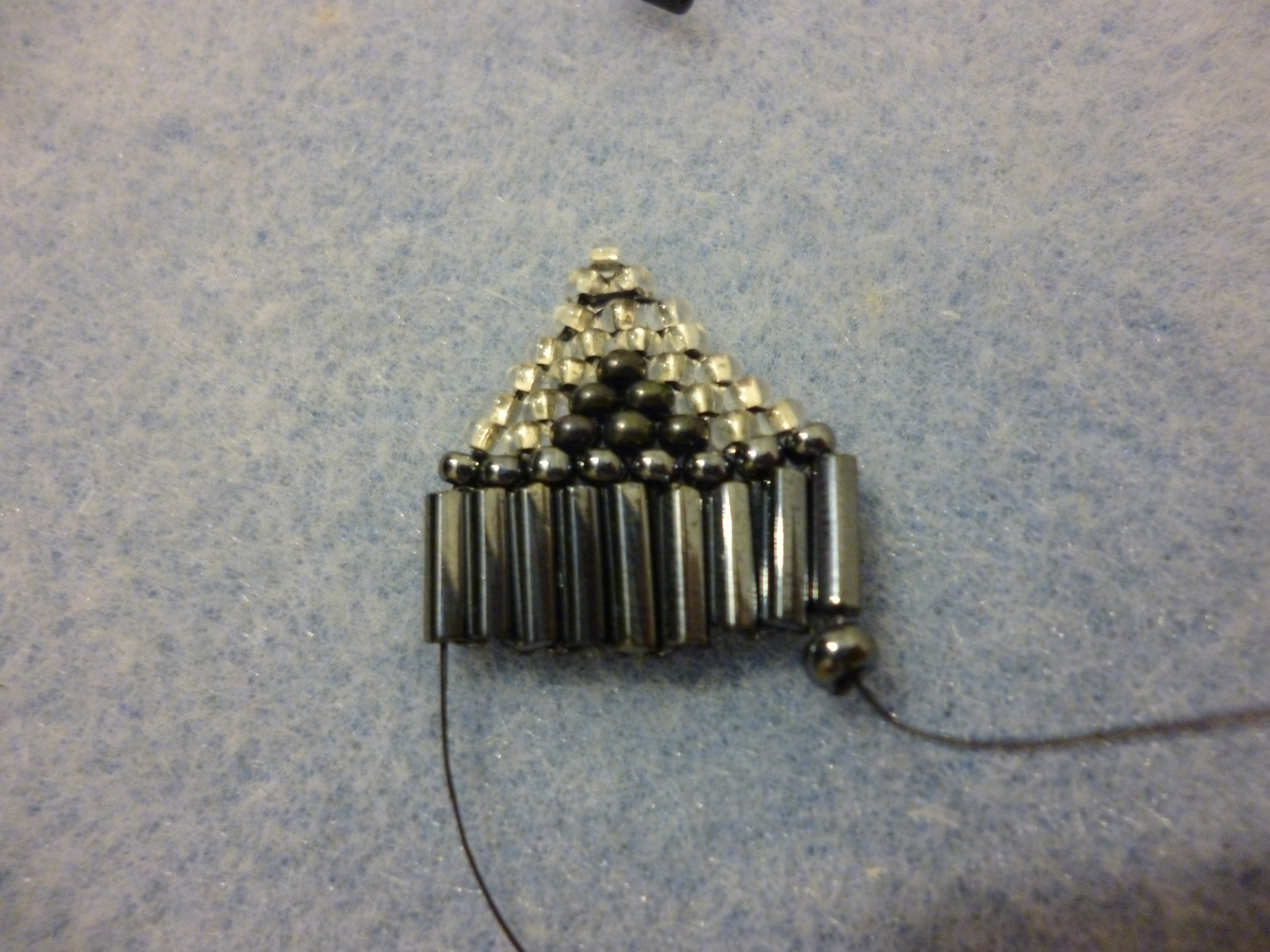 The first part is ladder stitch technically, followed by brick stitch. This gives you the pyramid shape at the top of your earrings. You can see that the pyramid is an odd shape and this is because some of the seed beads were differently shaped, so not the neatest thing in the world.