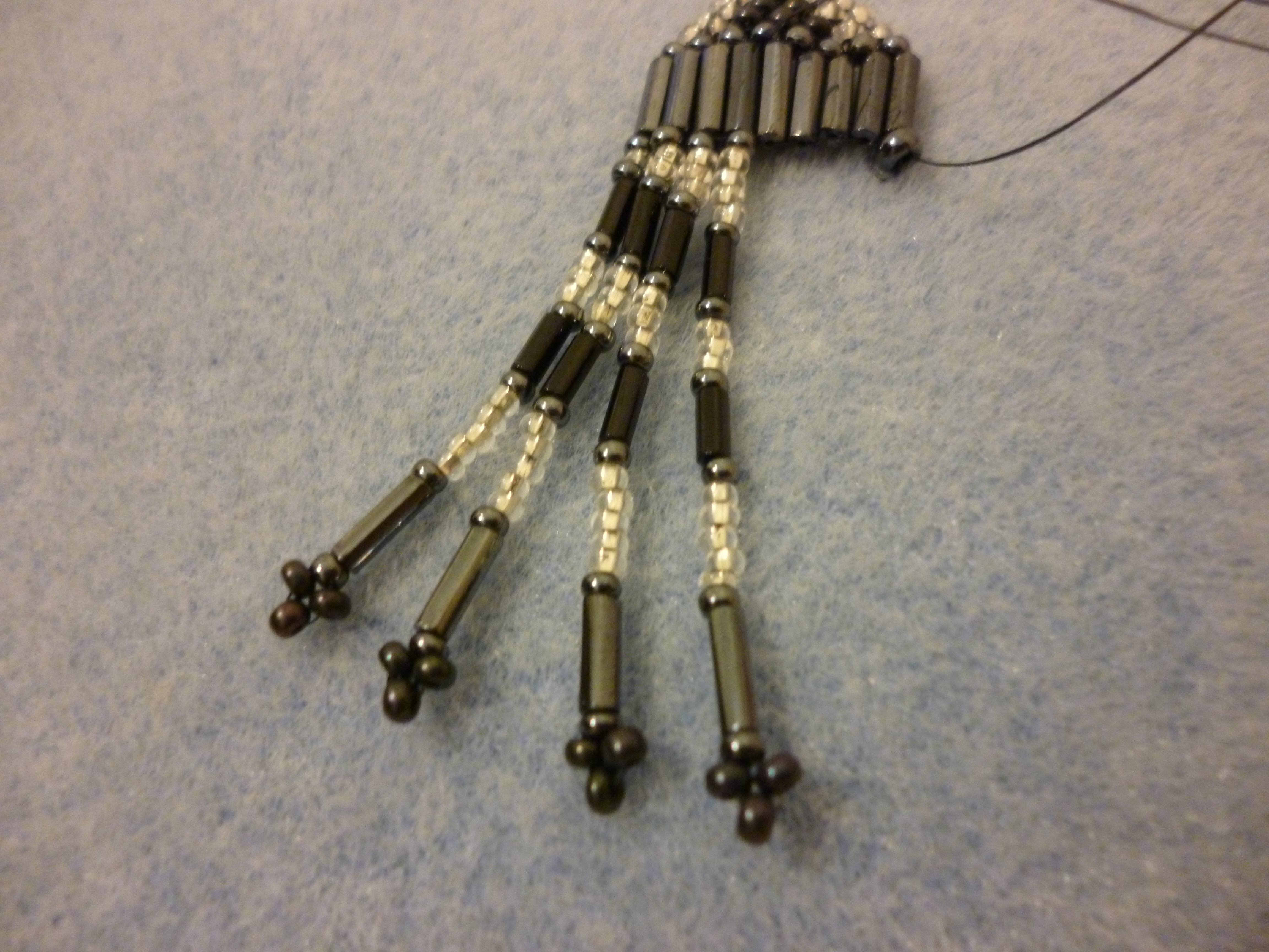 The fringe itself is pretty straightforward as I strung up a pattern of beads. Just make sure the thread isn’t visible at the bottom of the strands when the thread wraps back around.