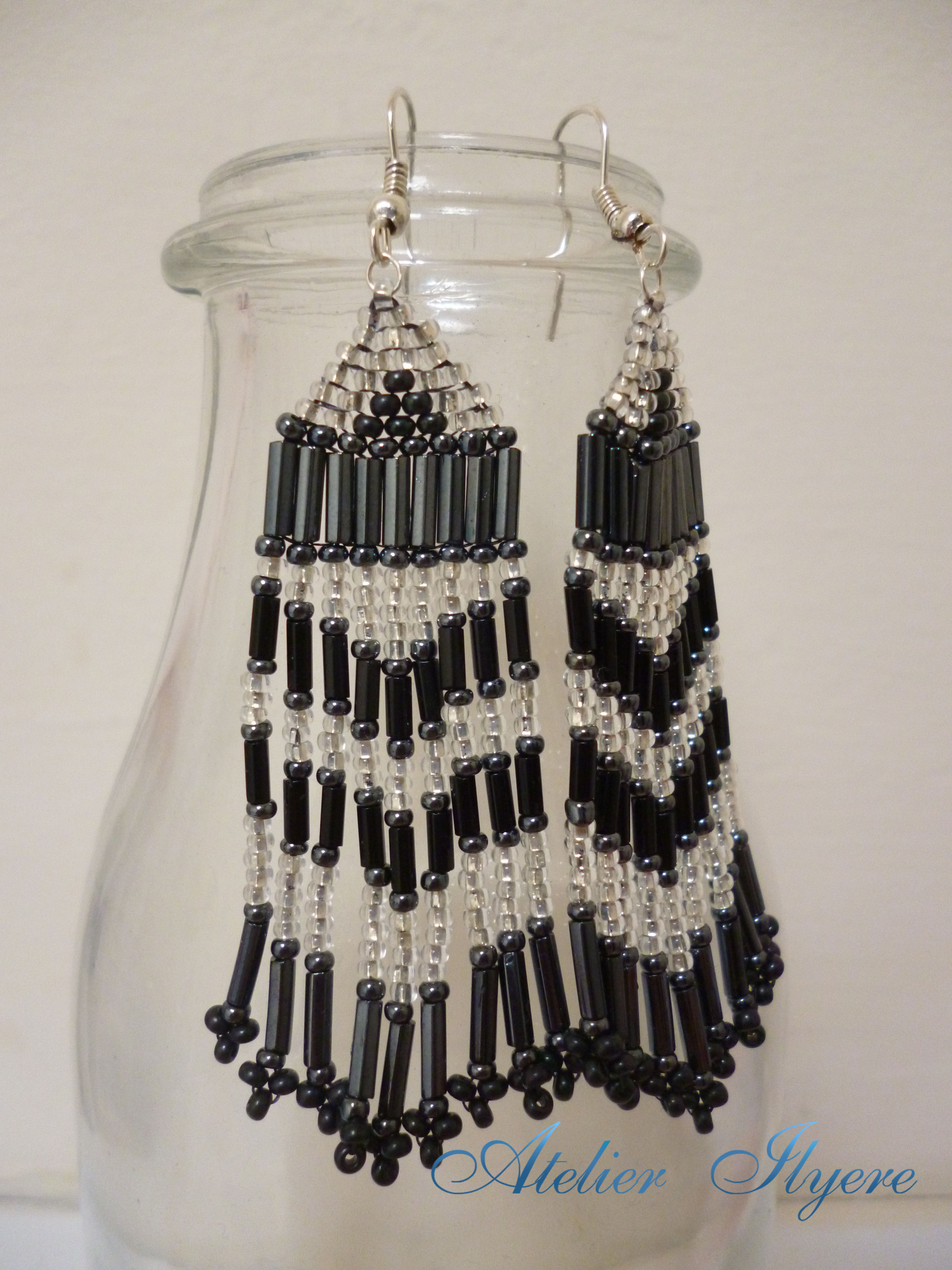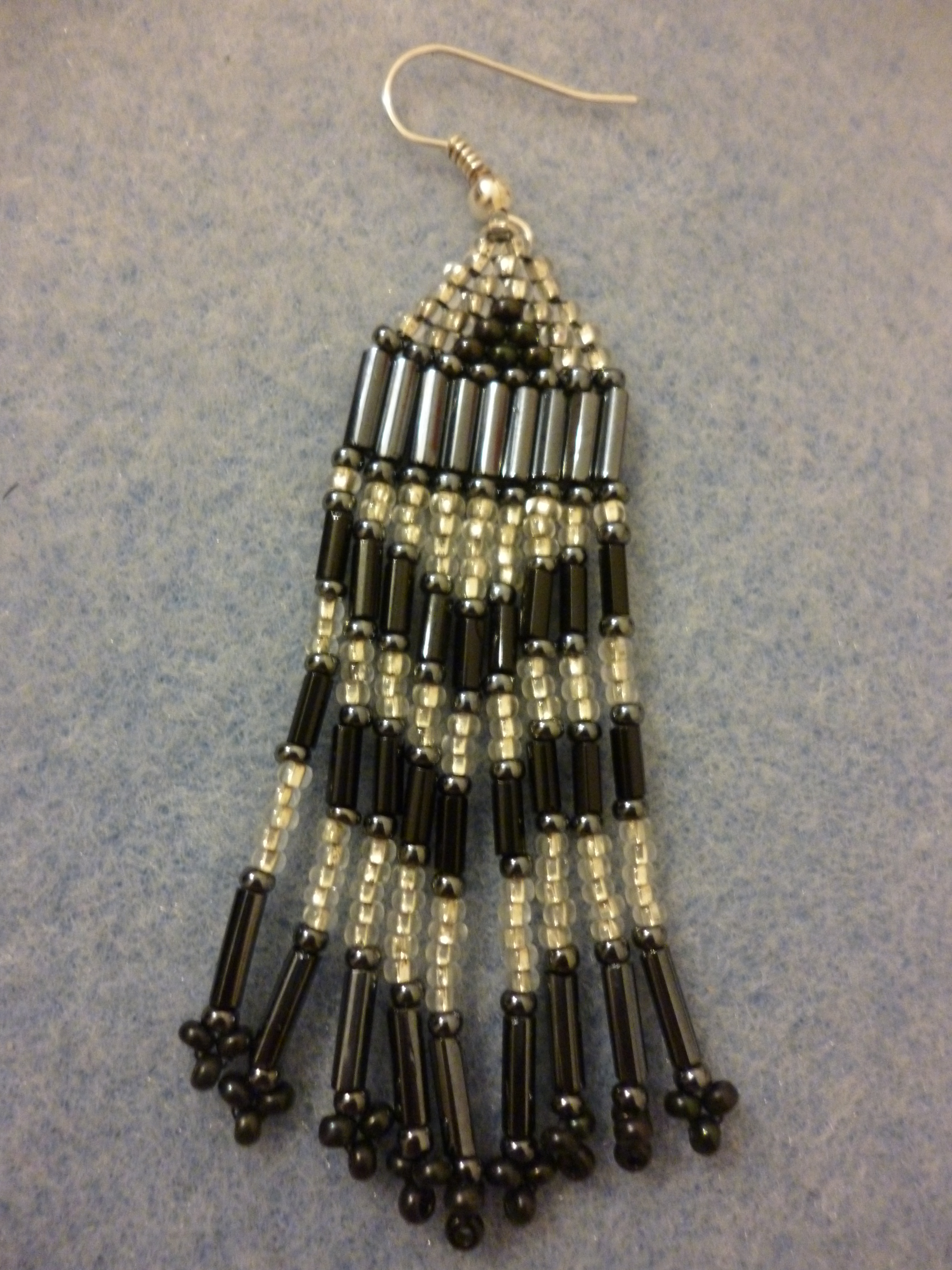Materials: Clear and black seed beads, black bugle beads in two different sizes, black beading thread, jump rings, earring hooks