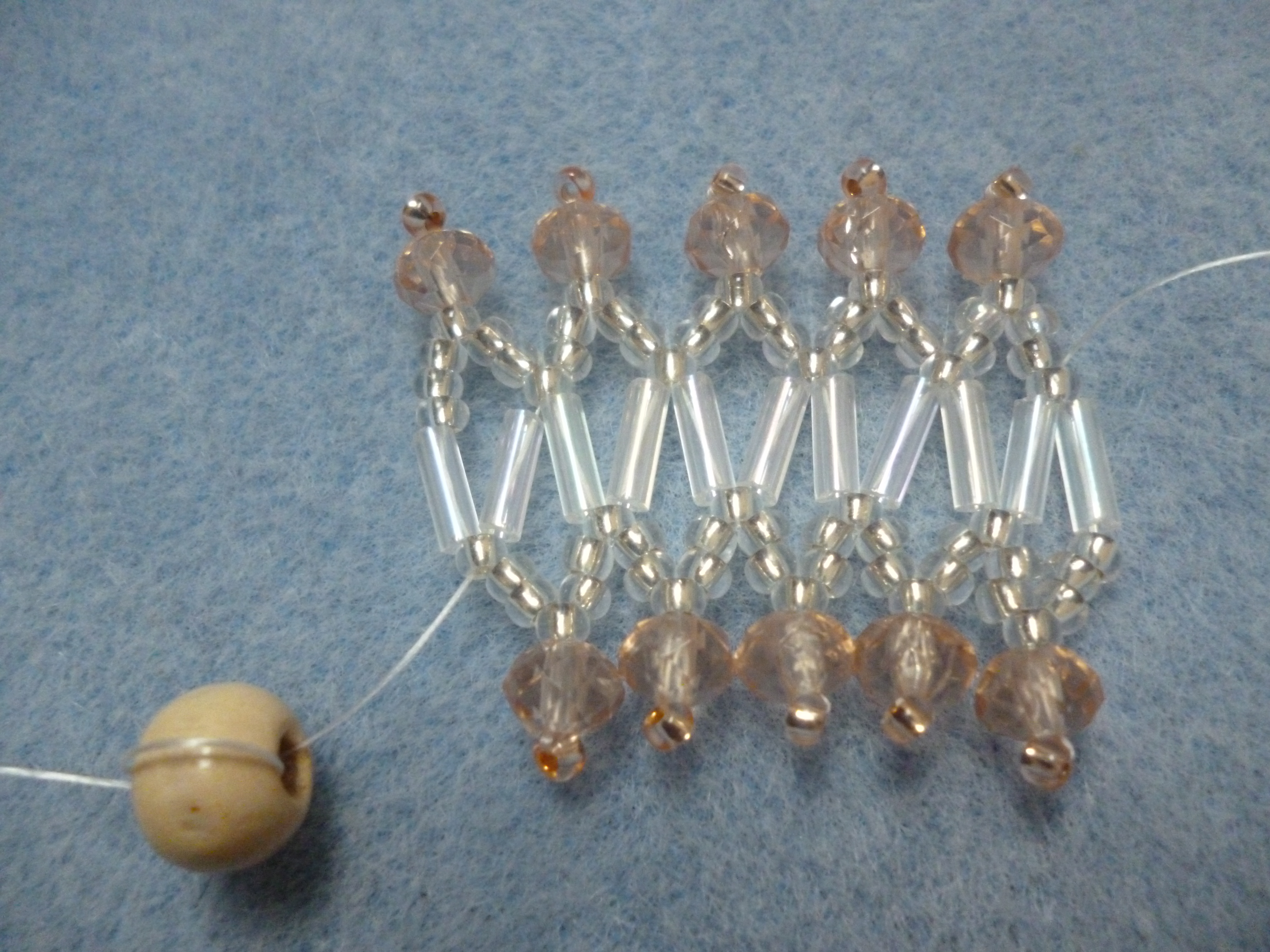 Materials: Silver-line seed beads, copper seed beads, light bronze faceted beads, prismatic-lined bugle beads, one large light brown glass bead, beading thread