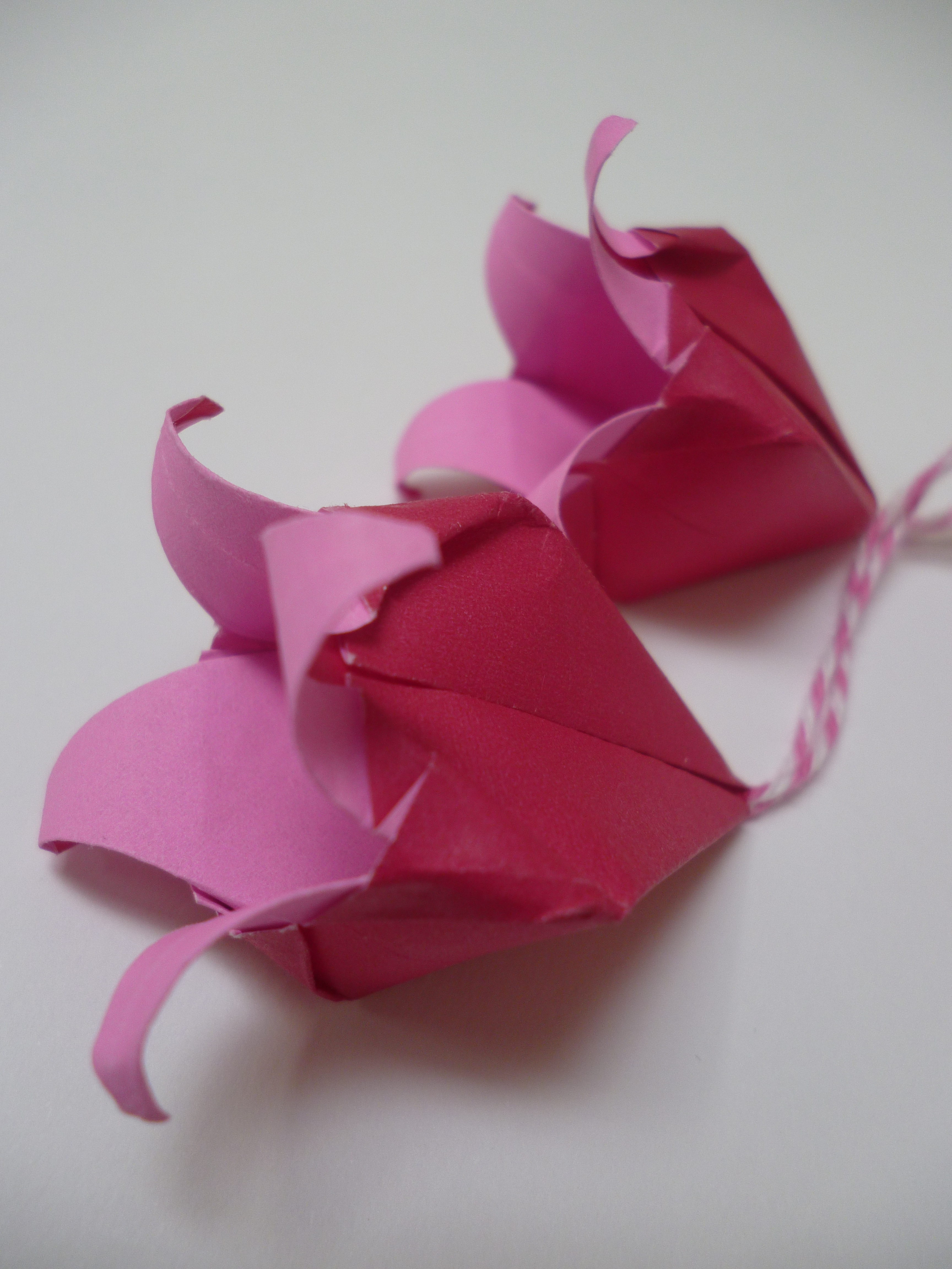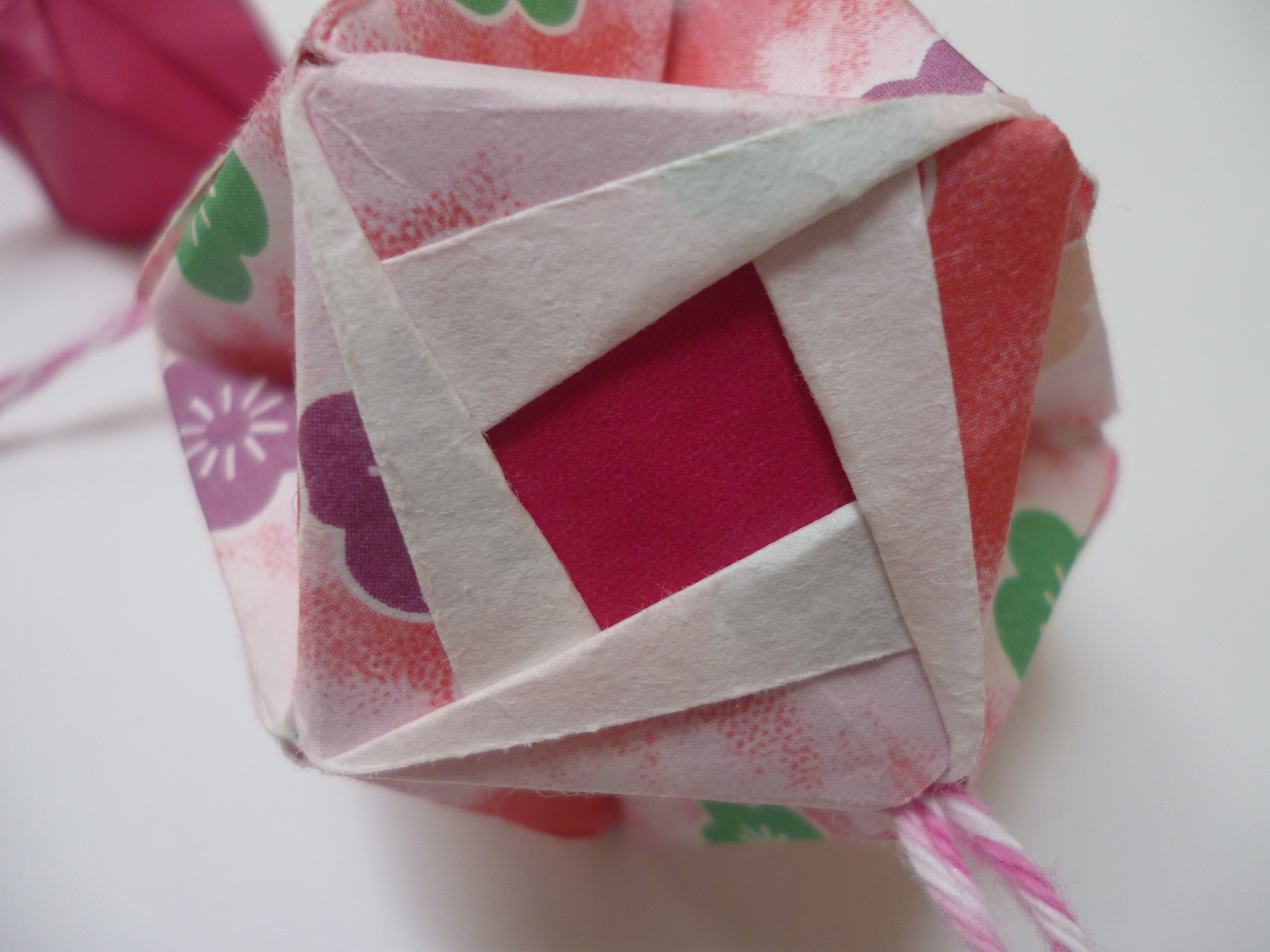 Materials: Six 7.5cm squares of patterned chiyogami, six 3.75cm squares of dual-sided pink paper, two 7.5cm squares of dual-sized pink paper, pink and dark pink twine