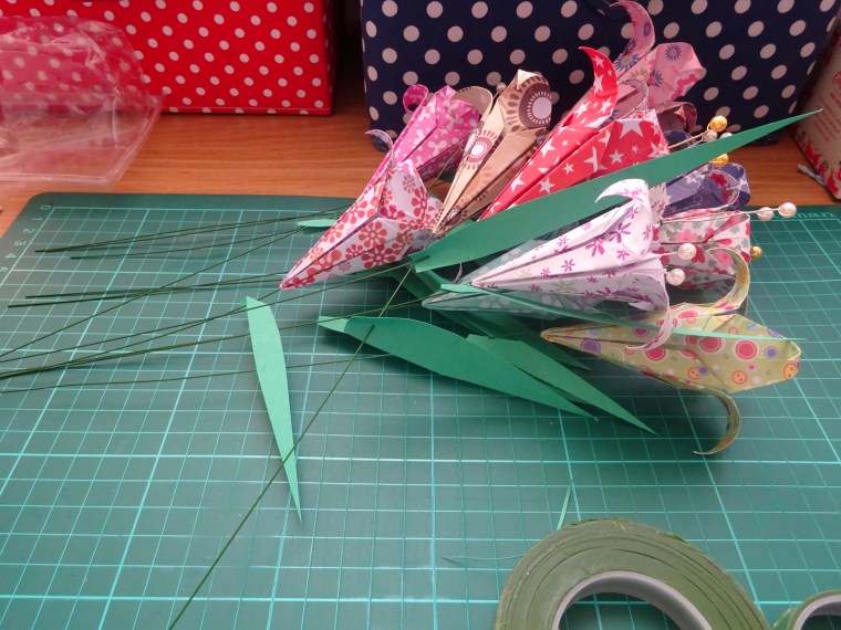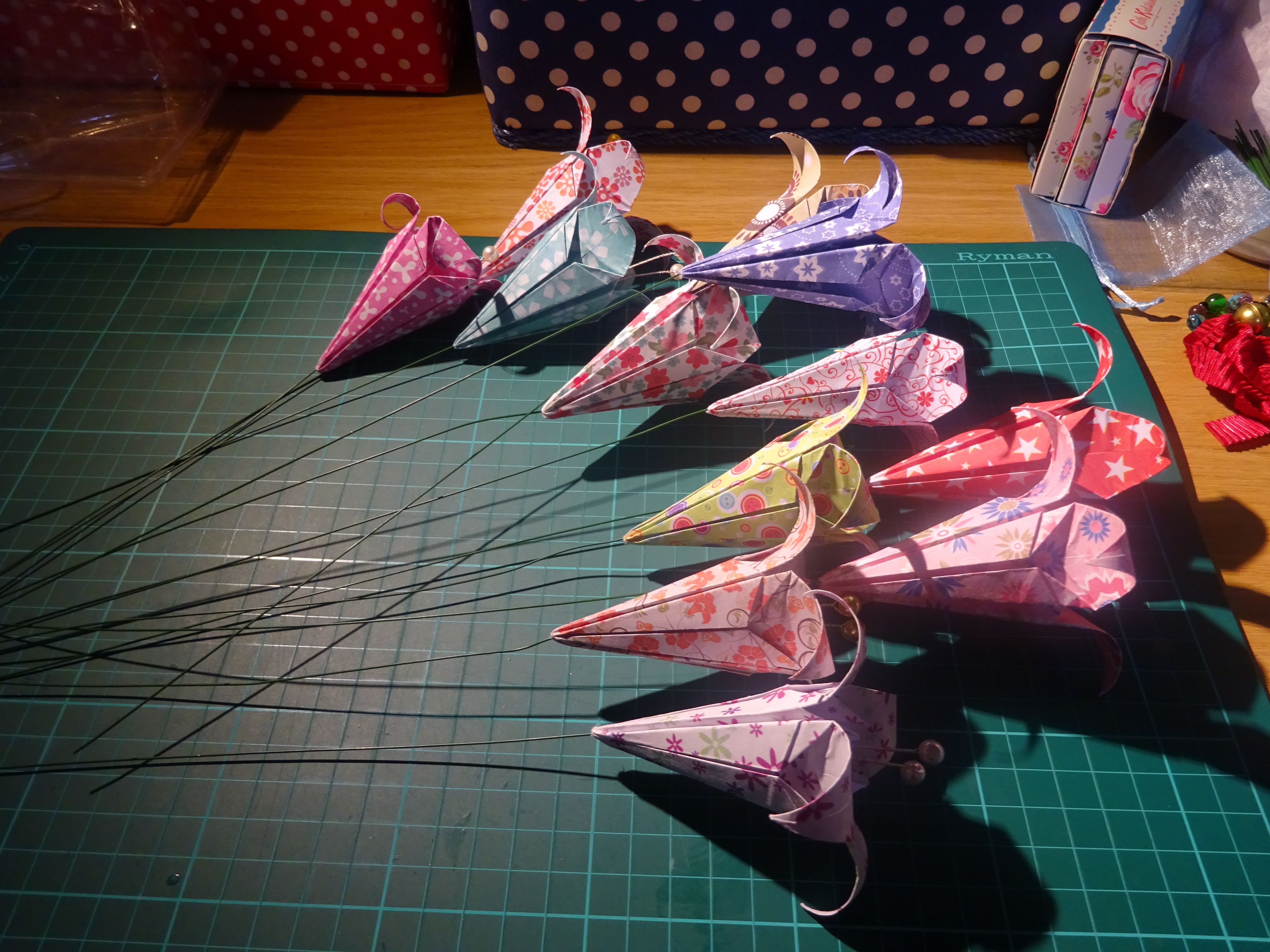 First, fold a number of origami lilies. I folded 10, one for each colour in a pack that I recently acquired.