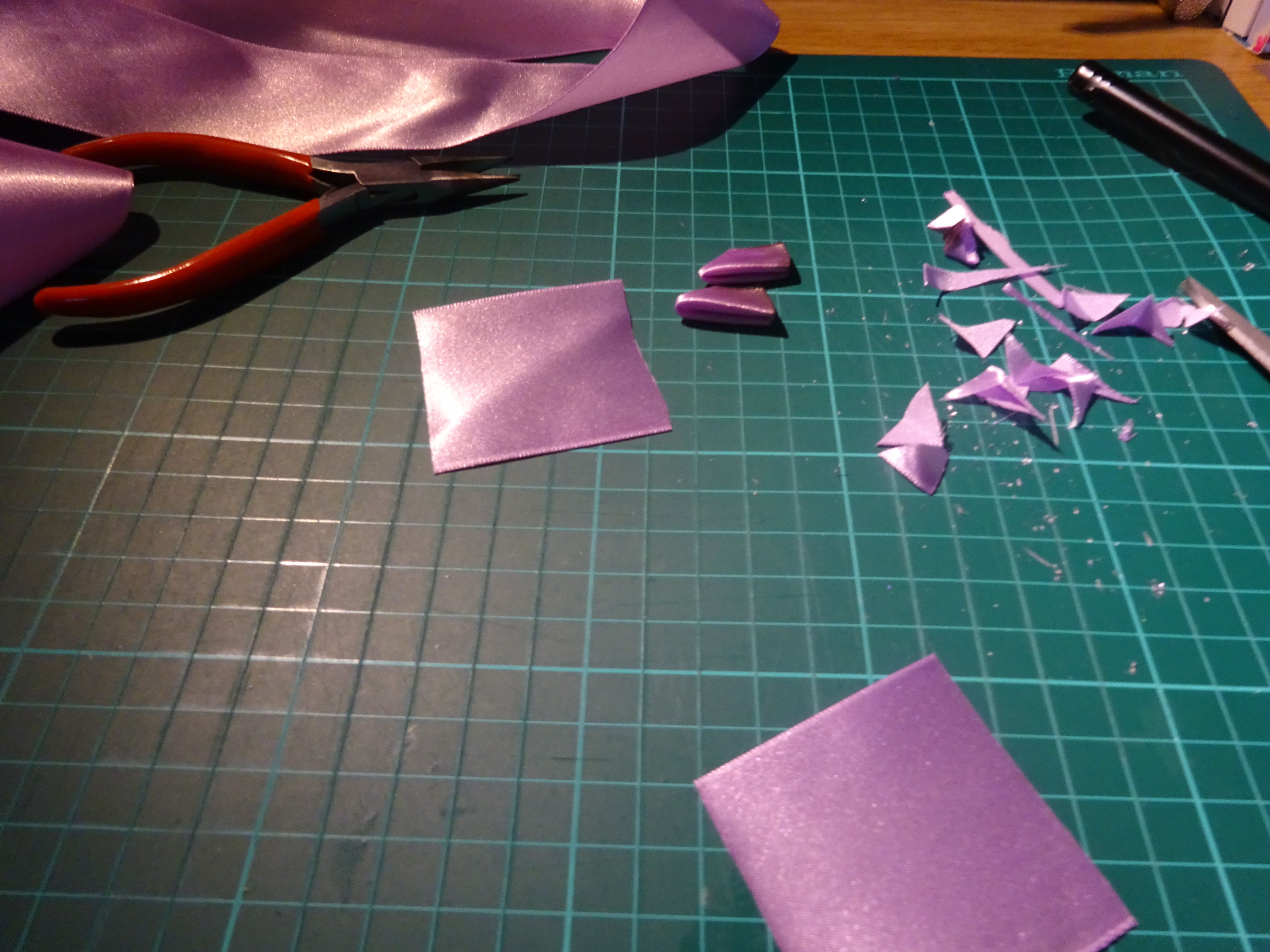 Ribbon is cut into squares and then folded into a certain shape. The flame helps seal the ribbon ends together, you can see the material slightly shrink. On this occasion, I held the flame too close to the ribbon, and it actually burnt the ends! You should only need to hold the ribbon just above the flame and no contact needs to be made.
