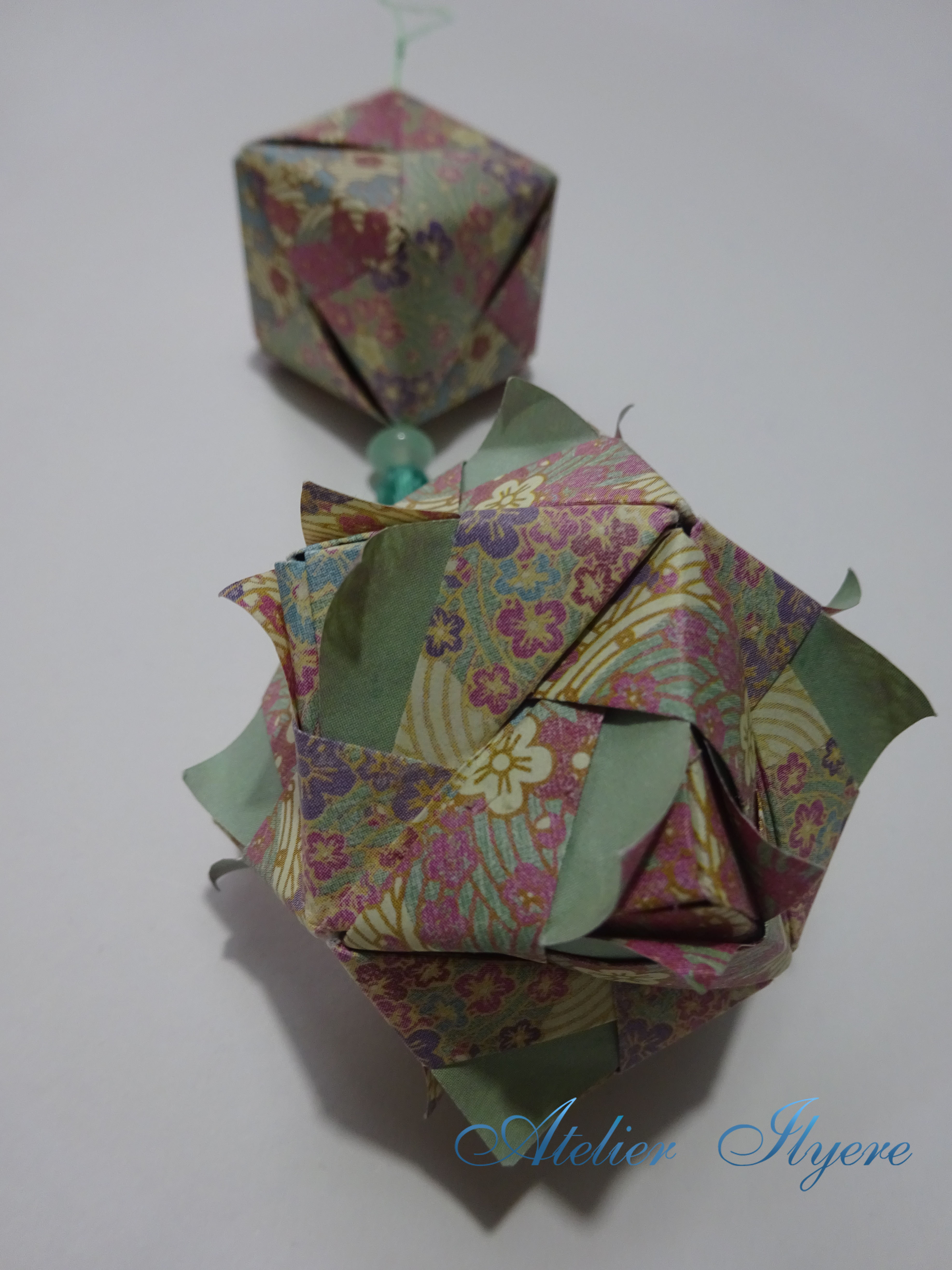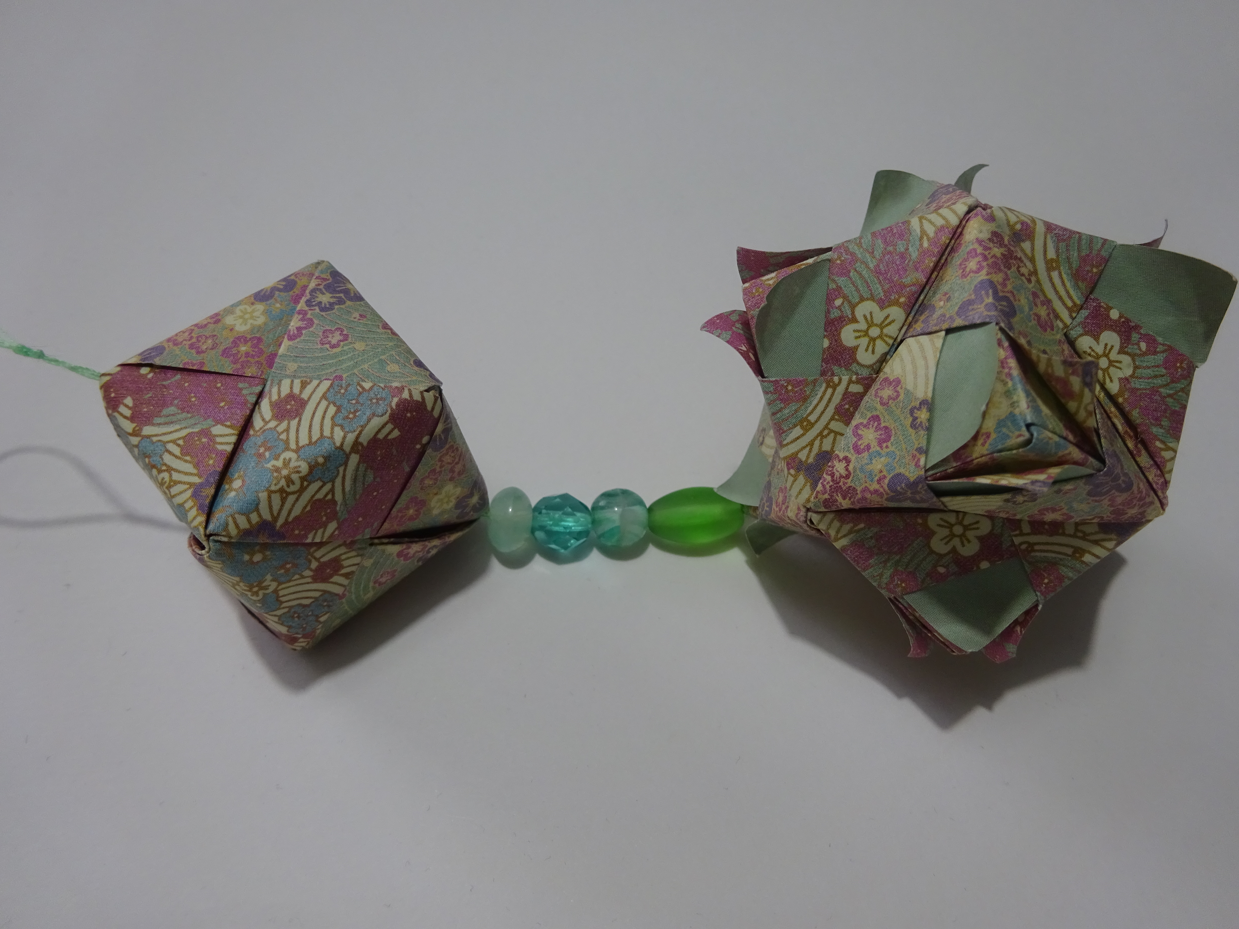 So instead I made a smaller 12-unit model. And it is very small compared to a 30-unit model. I added a Sonobe cube and some green glass beads to the string to decorate.