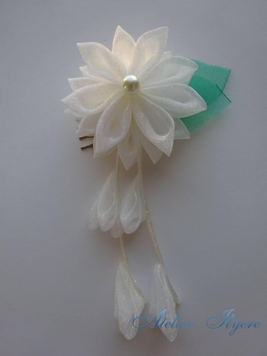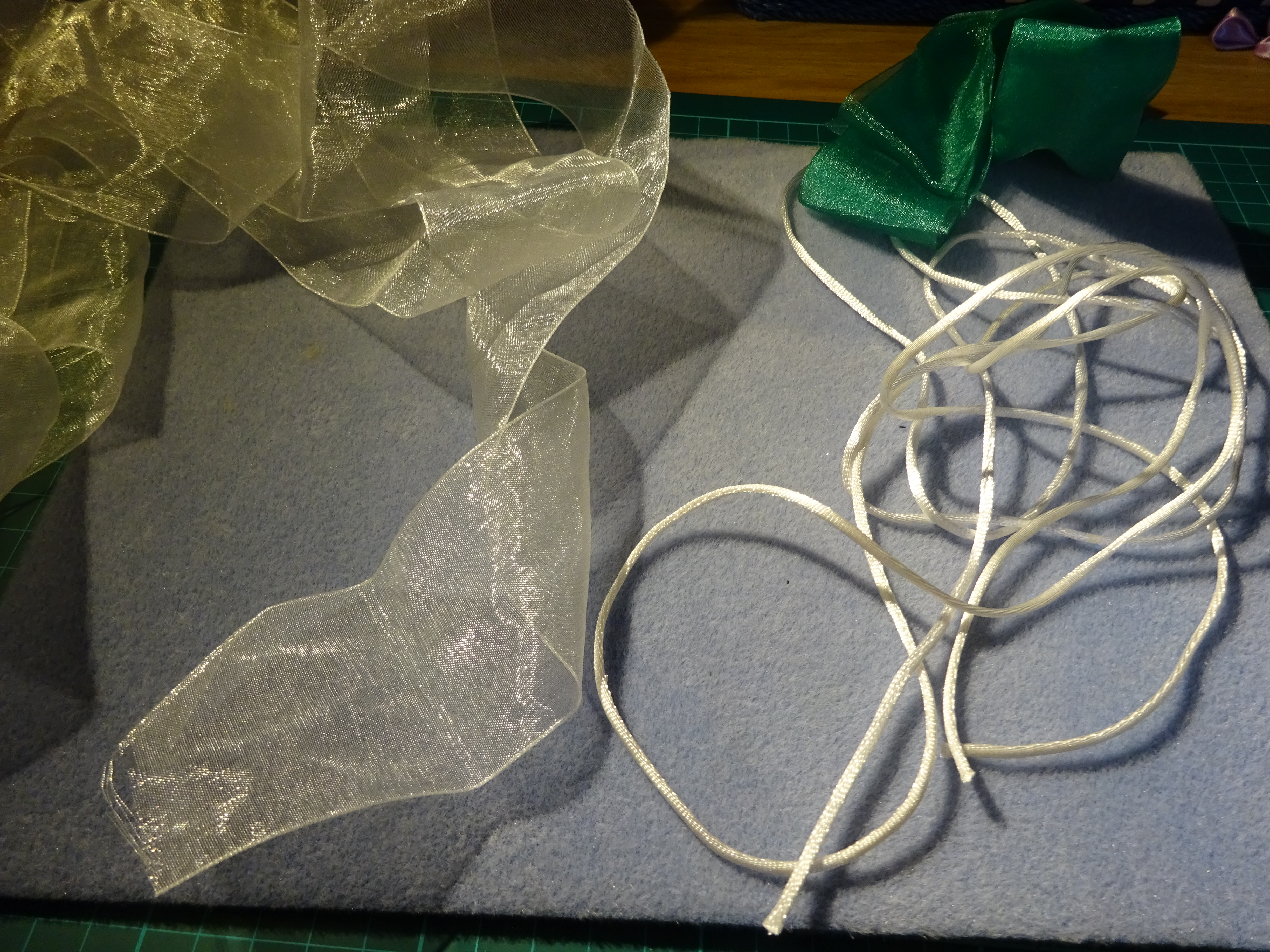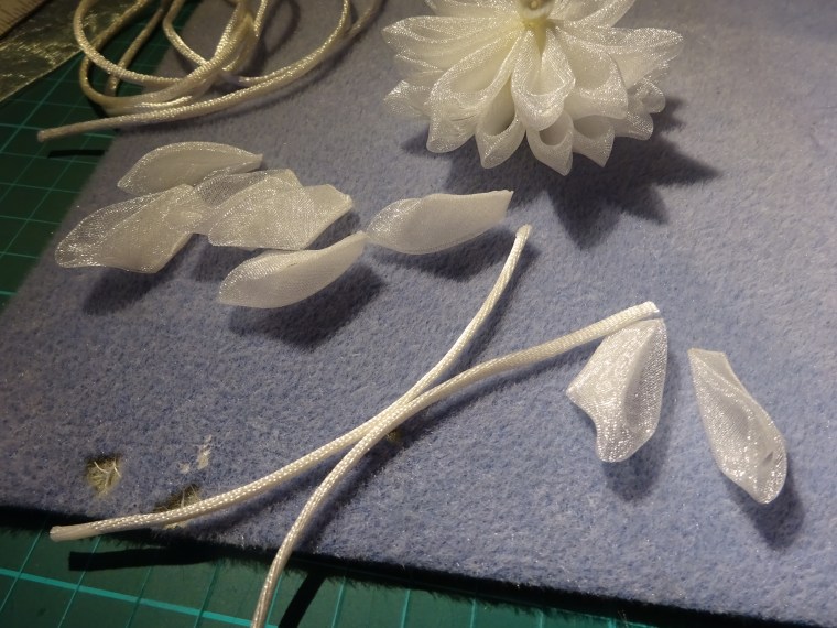 I started with white organza ribbon. Some green organza ribbon for leaves and white rattail for dangles are optional. You need a lot of ribbon, and it has to be quite wide as well because of the folding involved!