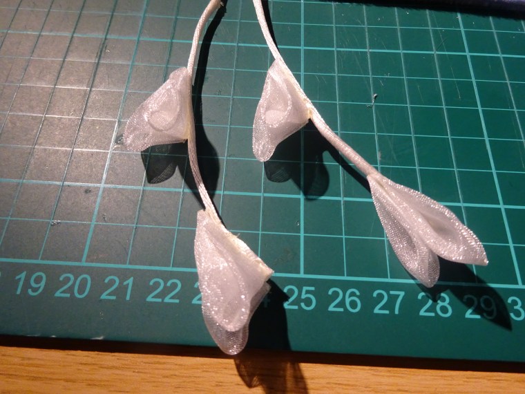 I made basic petals and glued them together with superglue. (Remember to seal the ribbon edges!) Then, just like in the video, I made a second layer to stack on top. I superglued a pearl on top to cover the centre. Unfortunately this is a bit unreliable to stick on – A more secure way would be to use fake stamens with stems!