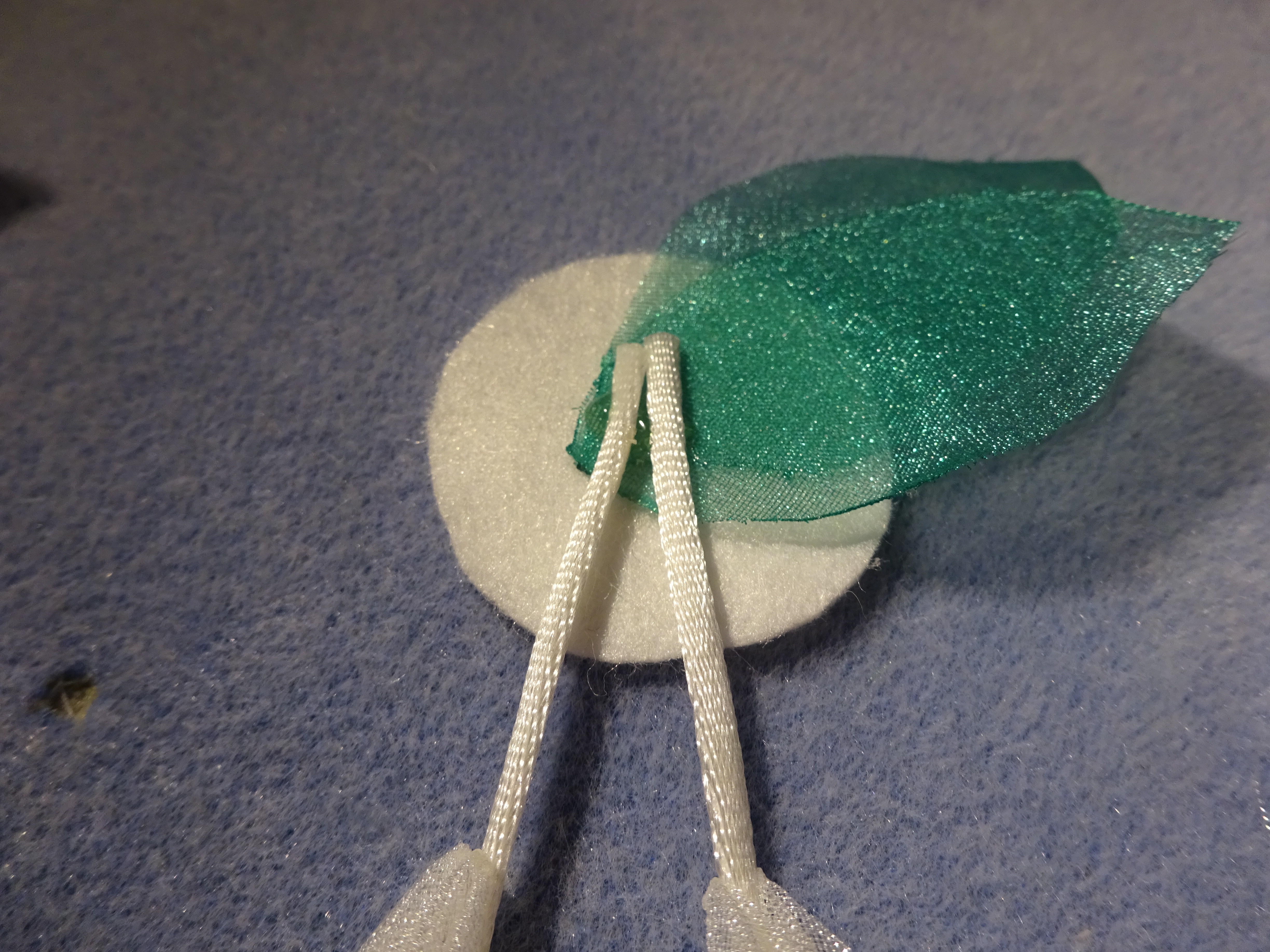 Lastly, if you wish to add leaves, cut the green organza ribbon into appropriate shapes. I sort of went for wide circles.