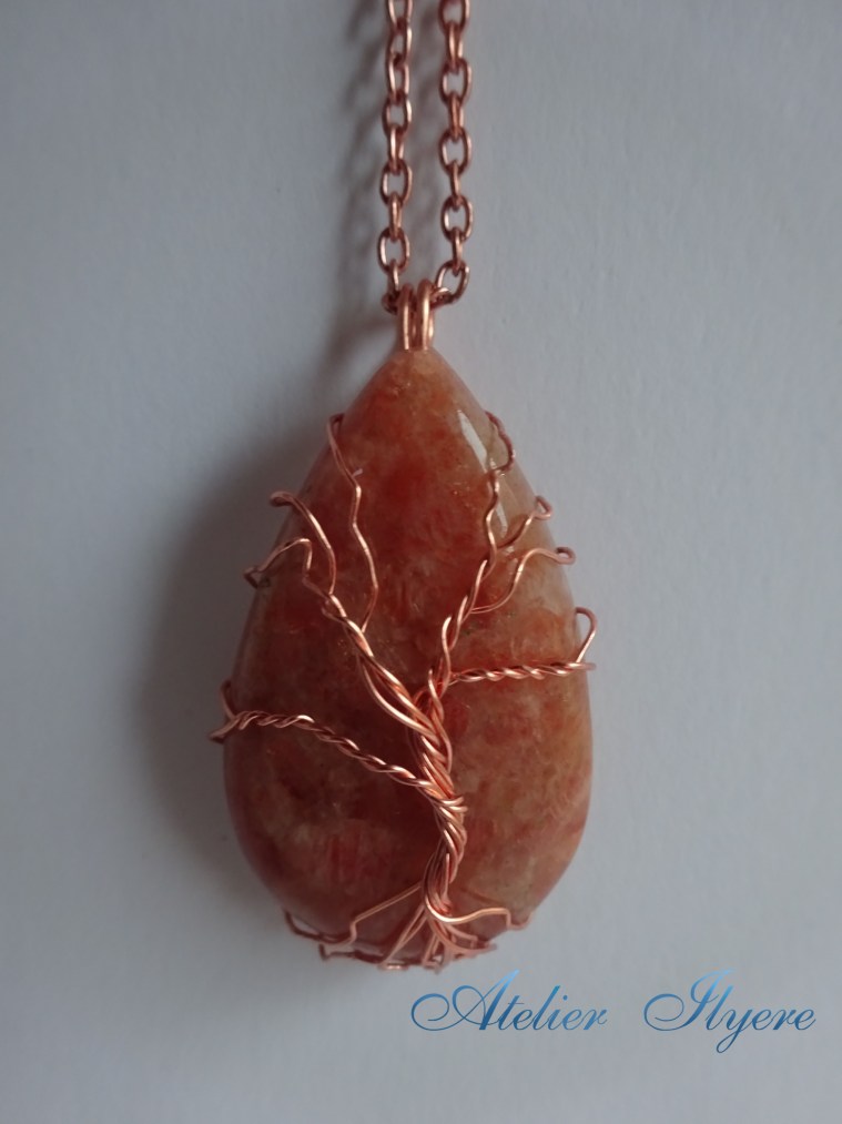 I bought this teardrop-shaped sunstone gemstone from a craft fair a while ago and finally decided on what to do with it recently. I couldn’t figure out how to frame it, so instead I wrapped a tree of life around it. I made a very simple tree with not that many wires and it did not take long at all!