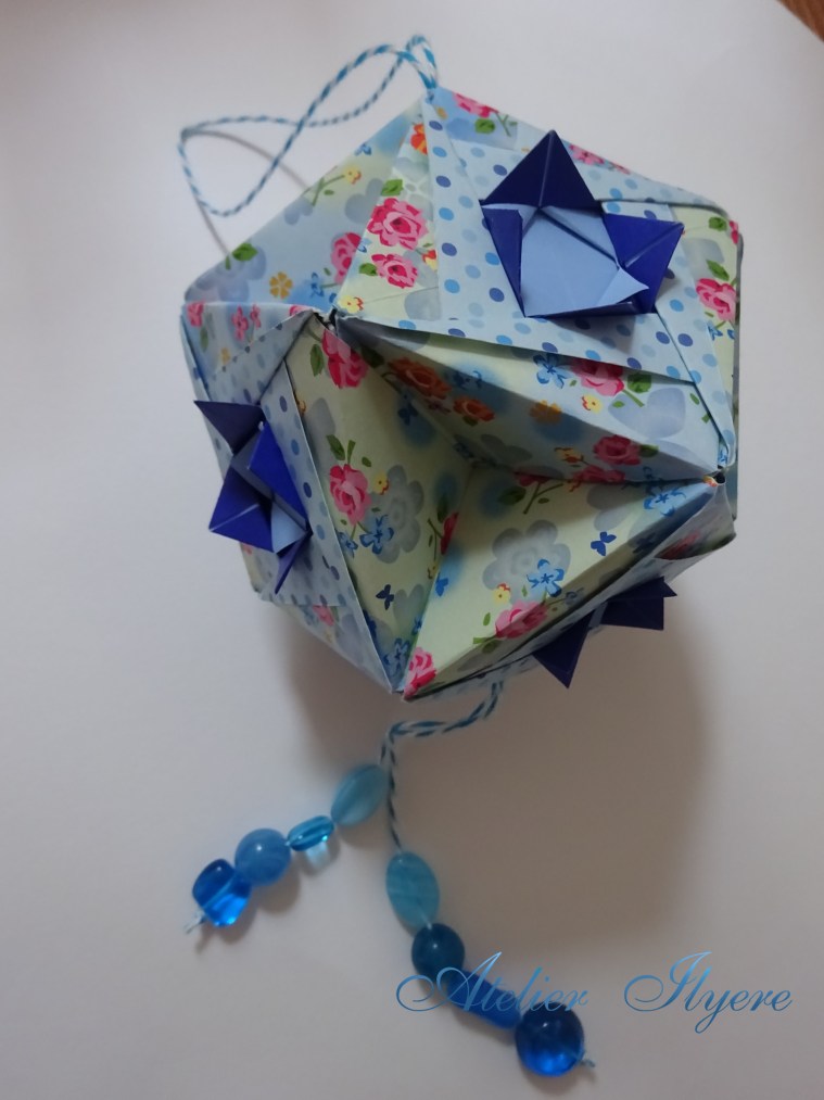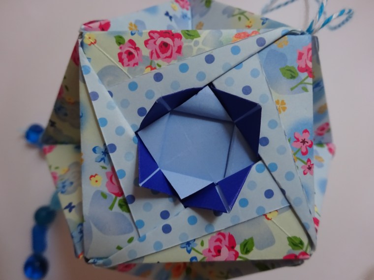 I decorated the twine with some blue glass beads. The size of the kusudama is so much nicer with 15cm paper!