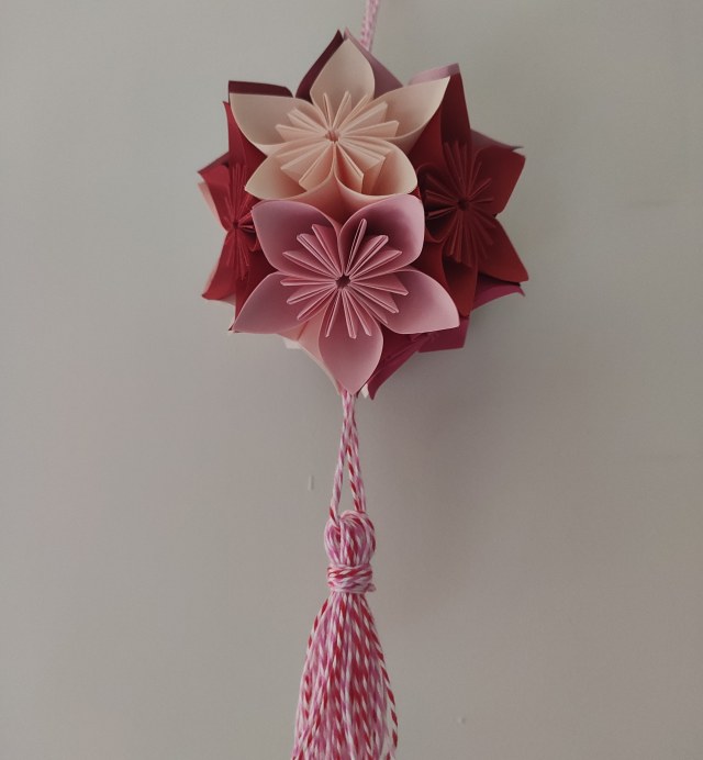 I made two sets of kusudama flowers with this red and pink paper set, and the first set were used in the bouquet that I posted in my last post. The second set have now been glued together to make a kusudama ball. I haven’t made one of these for a long time! The flowers were not quite the same size so gluing them together was quite difficult. I added a loop of twine thread to go down the middle and then attached a handmade tassel at the end.