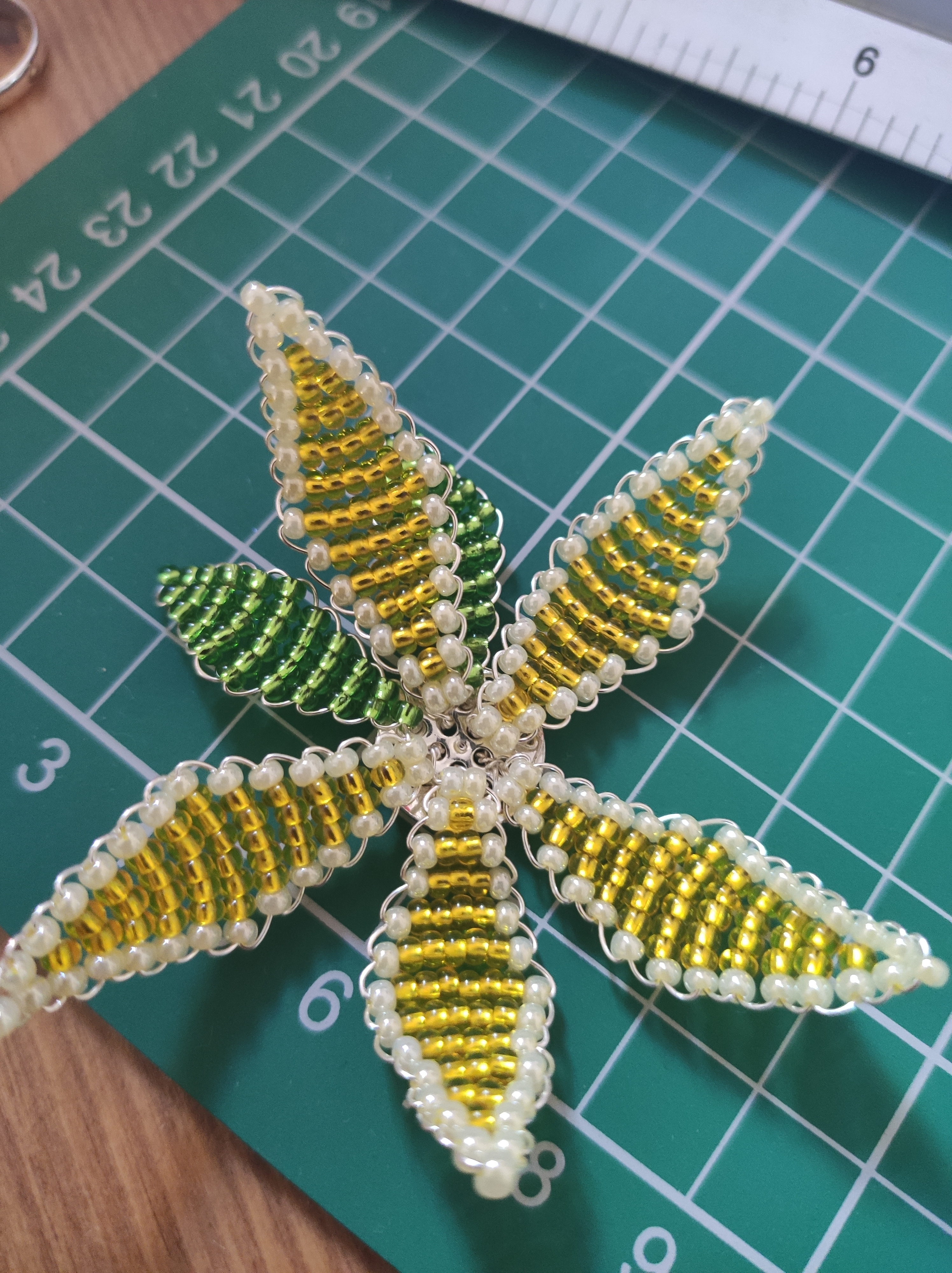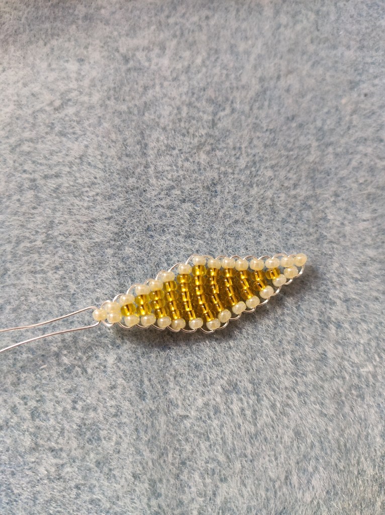I had a little bit of 0.4mm silver wire left, so I started weaving them into little petals. Pearl yellow for the outline, and clear yellow for the centre.