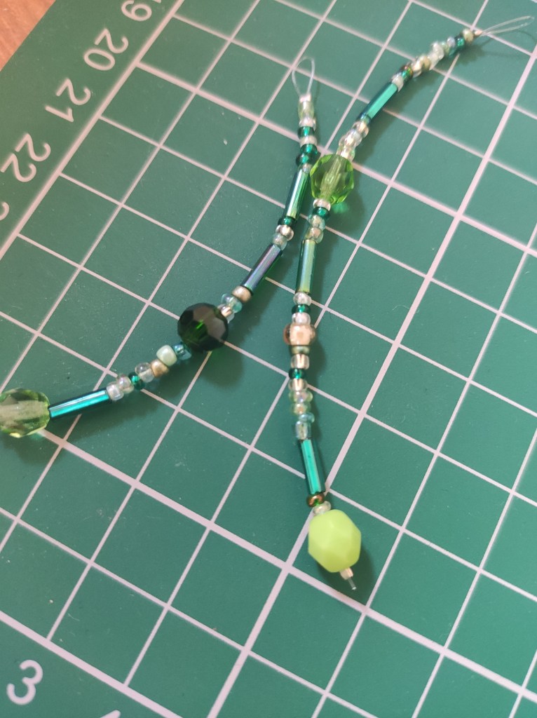 I fed another wire through with a large green button to cover the centre on the top, then I made two green tassels comprised of green seed beads, glass beads, and bugle beads attached to beading wire.