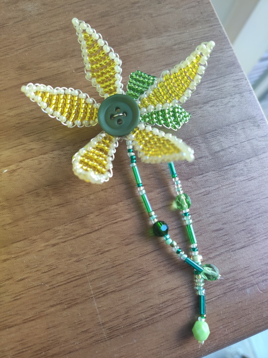 I made five petals for a flower, and two smaller petals of just green beads to represent leaves.