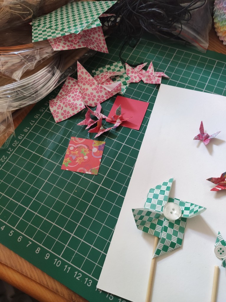 I used pink 7.5cm squares of paper to make Yoshizawa butterflies (there are two types, v1 is shown here on Origami Instructions), and green squares to make pinwheels. I also cut them into quarters to make smaller pieces.