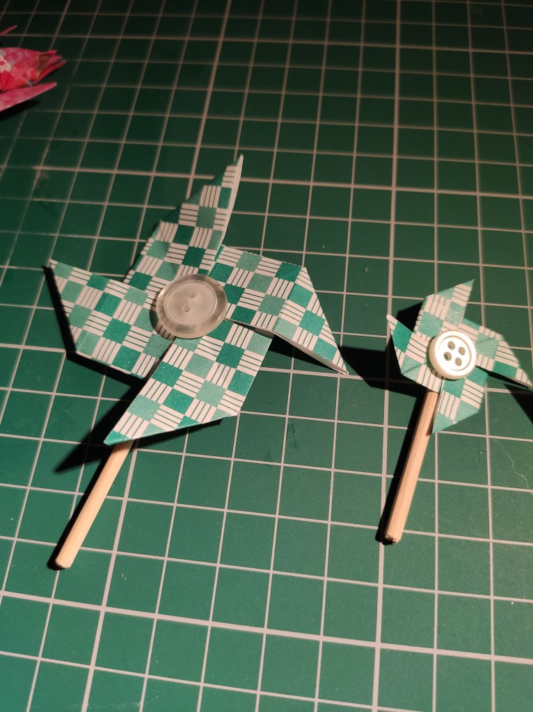 The pinwheels were made by cutting bamboo skewers to size and a white button was hot-glued to the front.