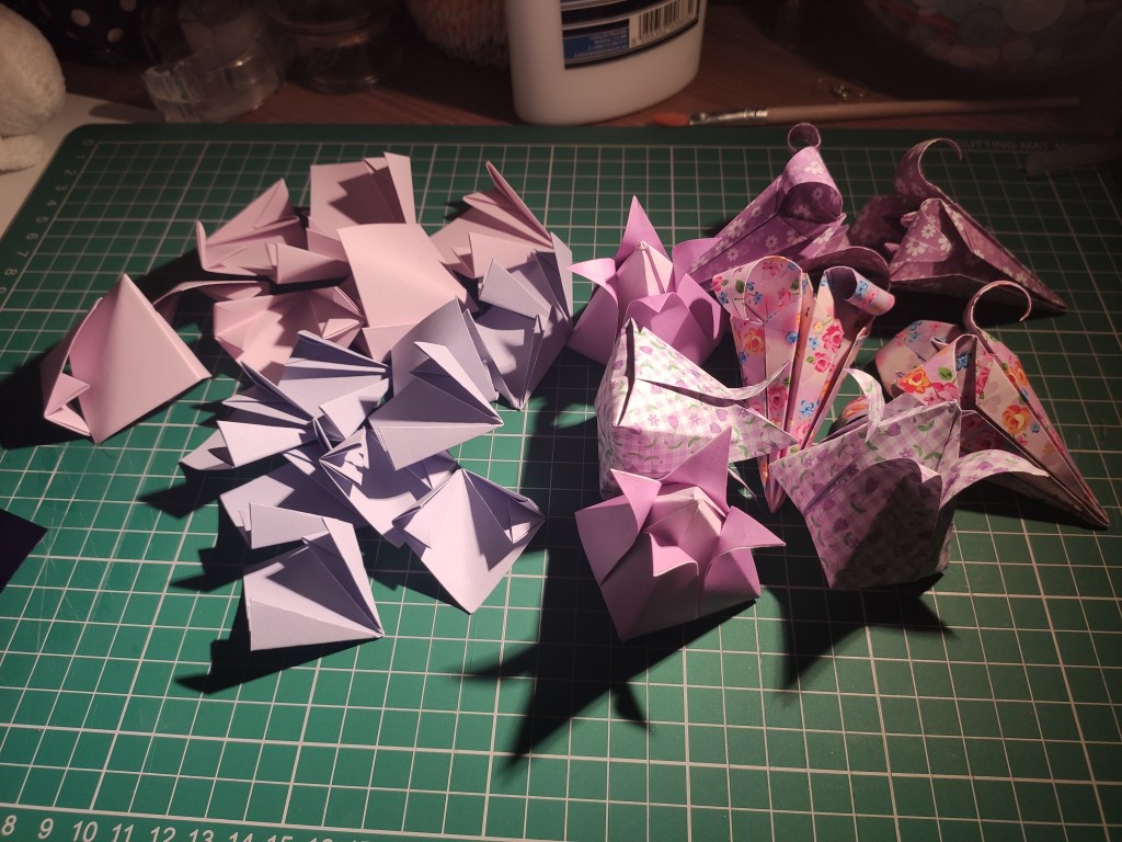 The most popular flowers are lilies, tulips, and kusudama flowers. I mixed up lots of colours on the same colour spectrum and different patterns. I also added some carambola flowers later – I had to learn how to make these from a video fairly quickly but I will come back to this in a different project!