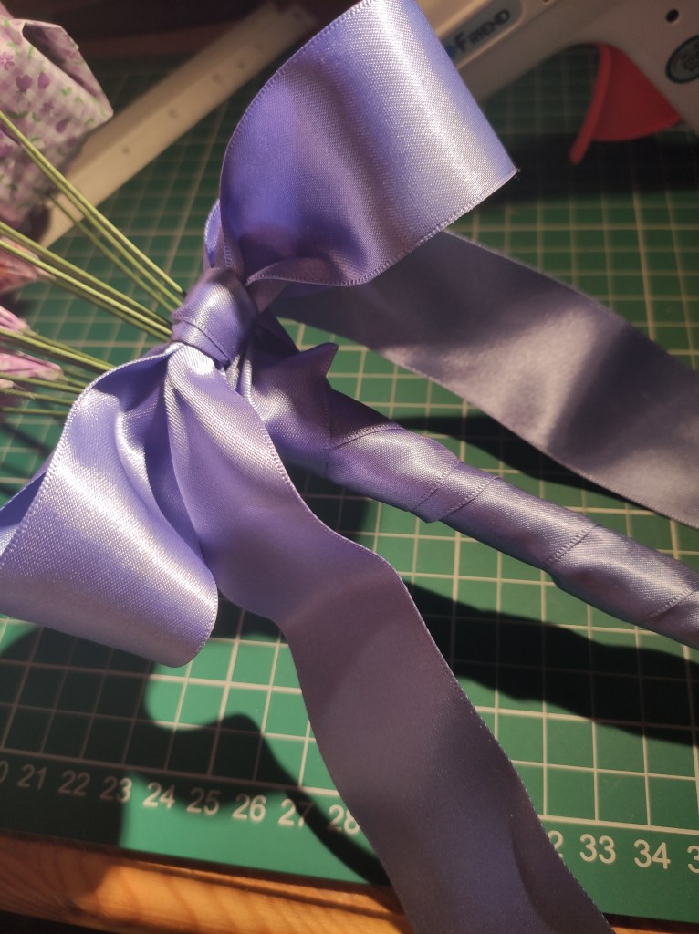 I also needed some floral tape to hold the stems together. I learnt a neat trick to cover the bottom of your bouquets with a piece of spare ribbon glued to the bottom, before the wrapping step.