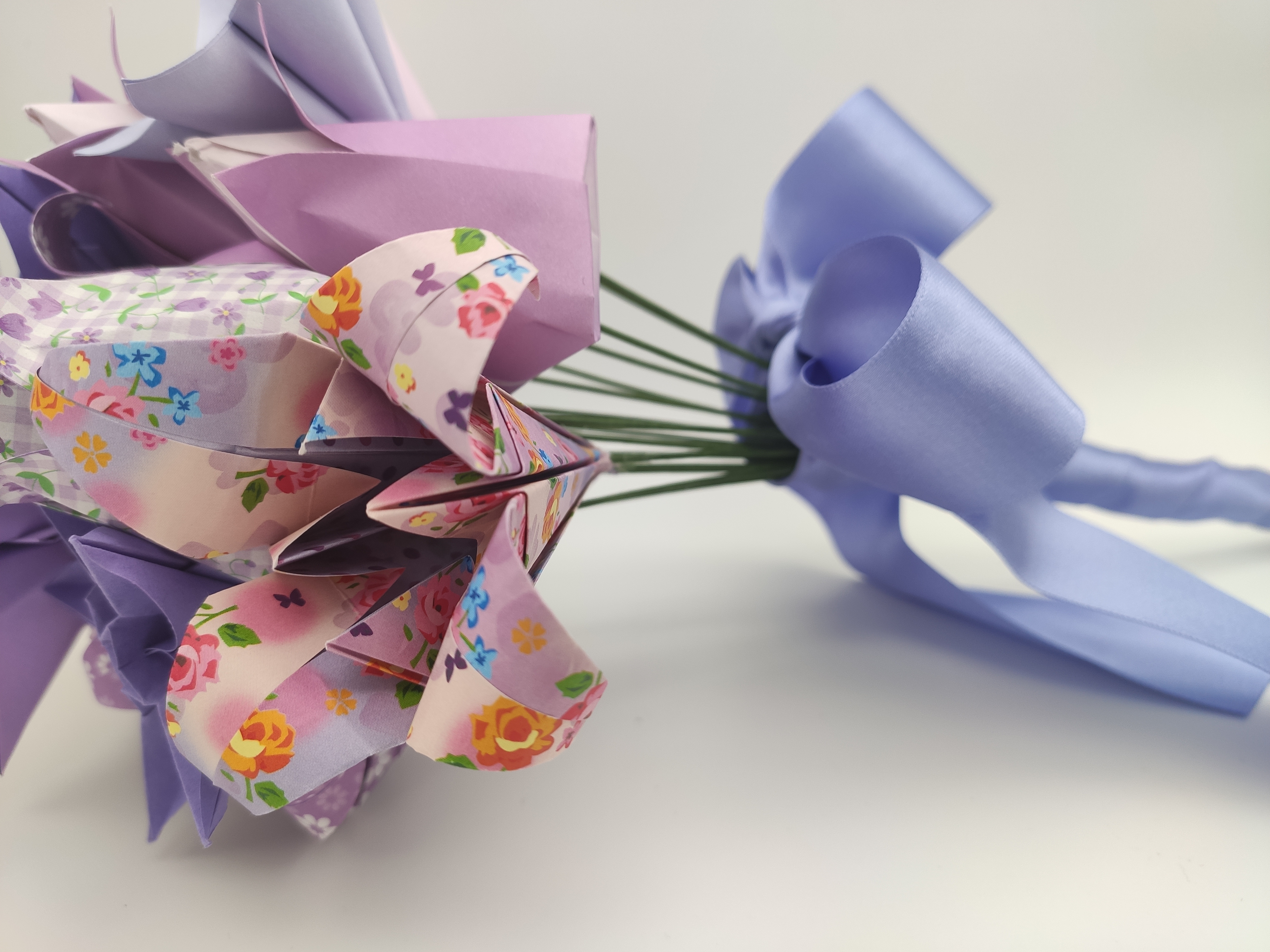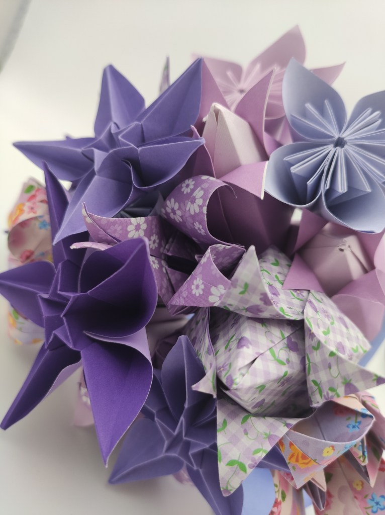 When you look up origami bouquets, you might see images of different types of origami flowers, folded from patterned or themed paper, and tied up neatly and used as a decoration or even as a bridal bouquet. Most of the bouquets I’ve made before have all been one type of flower but in different colour shades, so I thought I should spend some time branching out.