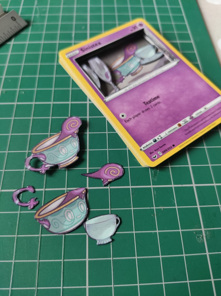 Using a craft knife, I cut out layers with the items nearest to the borders and some extras of other assorted duplicate cards with just the frame to add more depth. I also cut out extra Sinistea parts to make the main body have depth too.