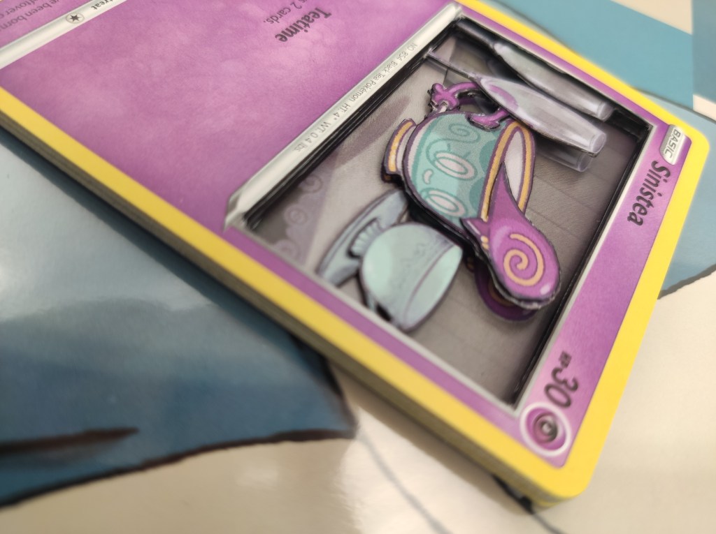 The card layers were glued on using a craft glue stick that works well with card and paper. The main Sinistea body used a small piece of foam tape and stuck down with the appropriate layer.