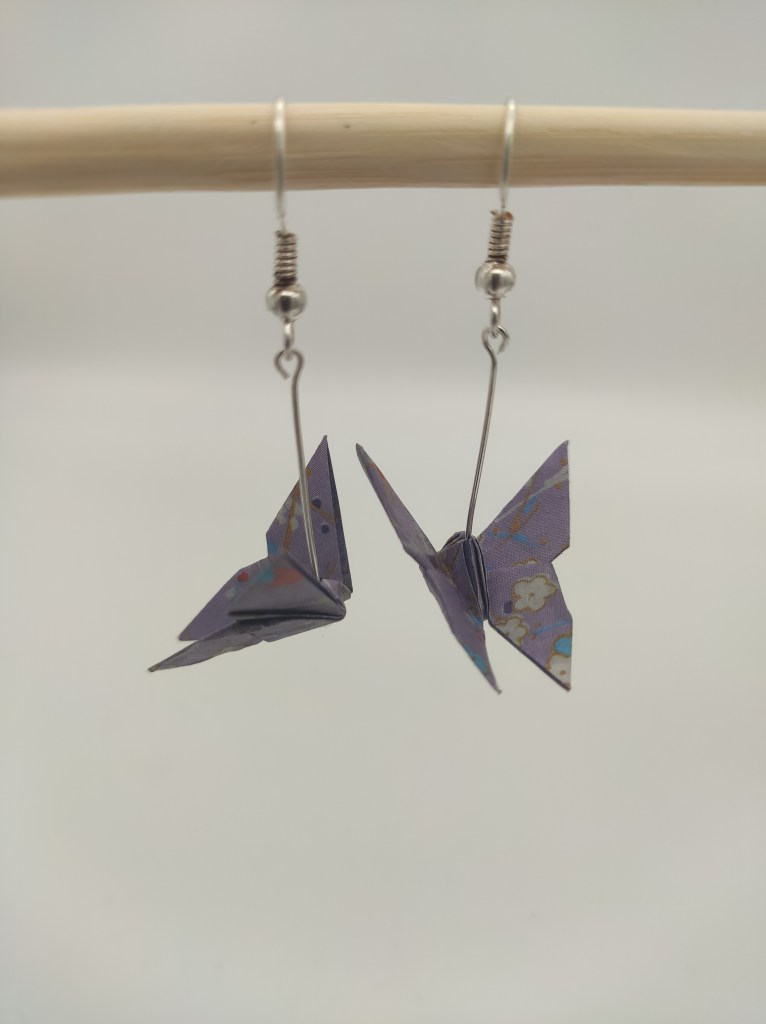 The next pair were some origami Yoshizawa butterflies on silver end pins and earring hooks. It can be quite tough folding this on such a small scale because of the part where you have to reverse-fold the body. I used floral purple paper for this.