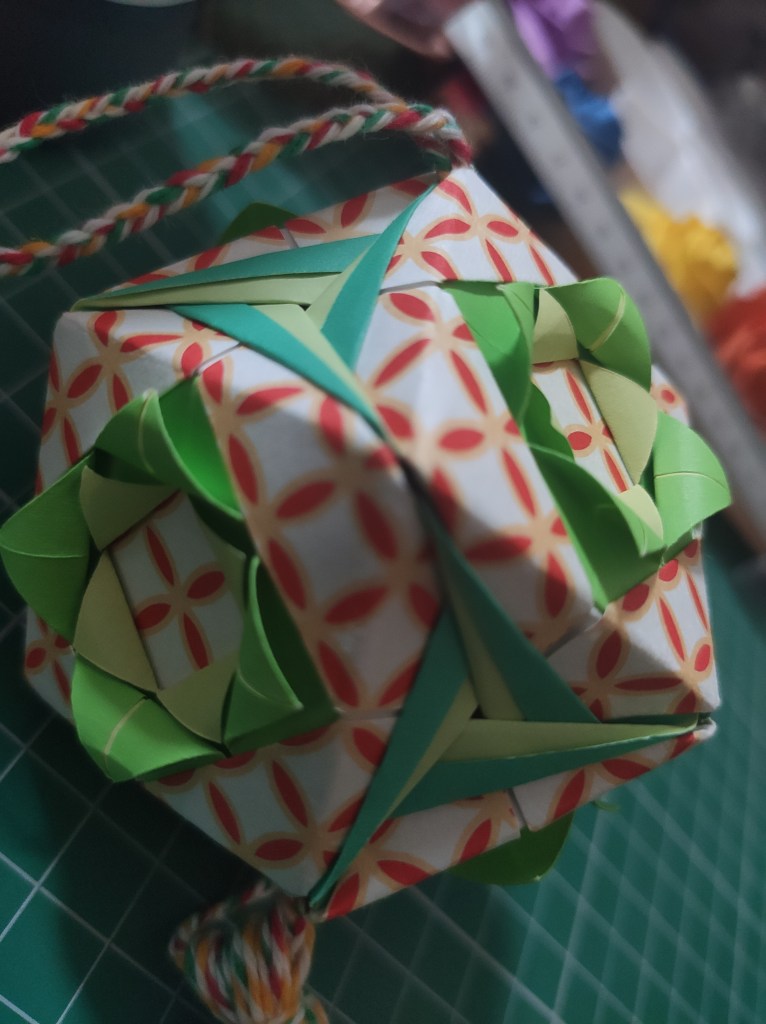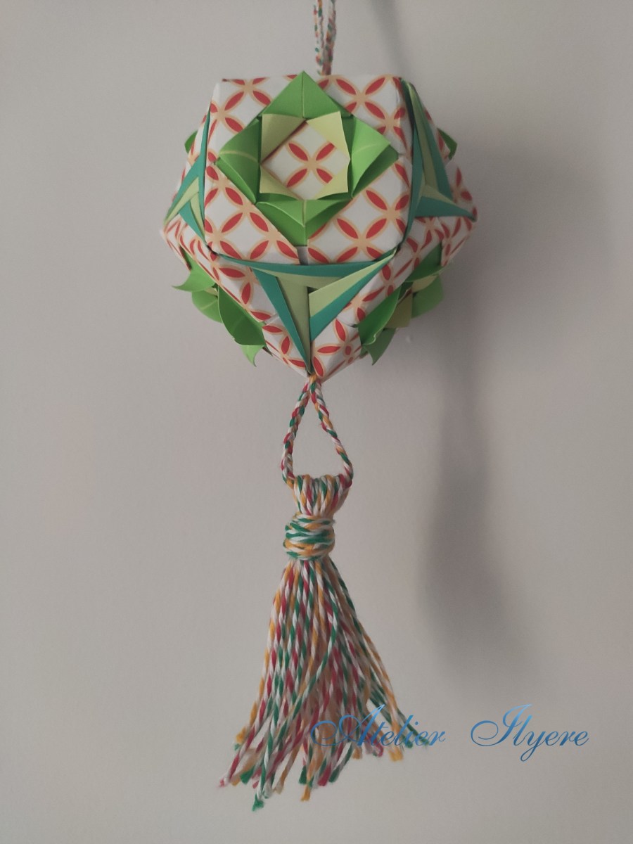 For decorating a kusudama, I like to add a thing to hang below the model. Here I’ve made twine tassels with the same colour theme as the kusudama.